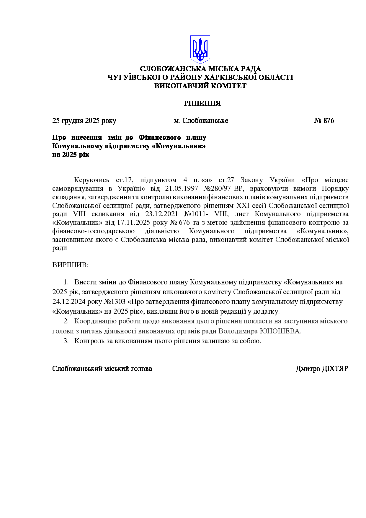 Рішення виконавчого комітету №876 Про внесення змін до Фінансового плану Комунальному підприємству «Комунальник» на 2025 рік.