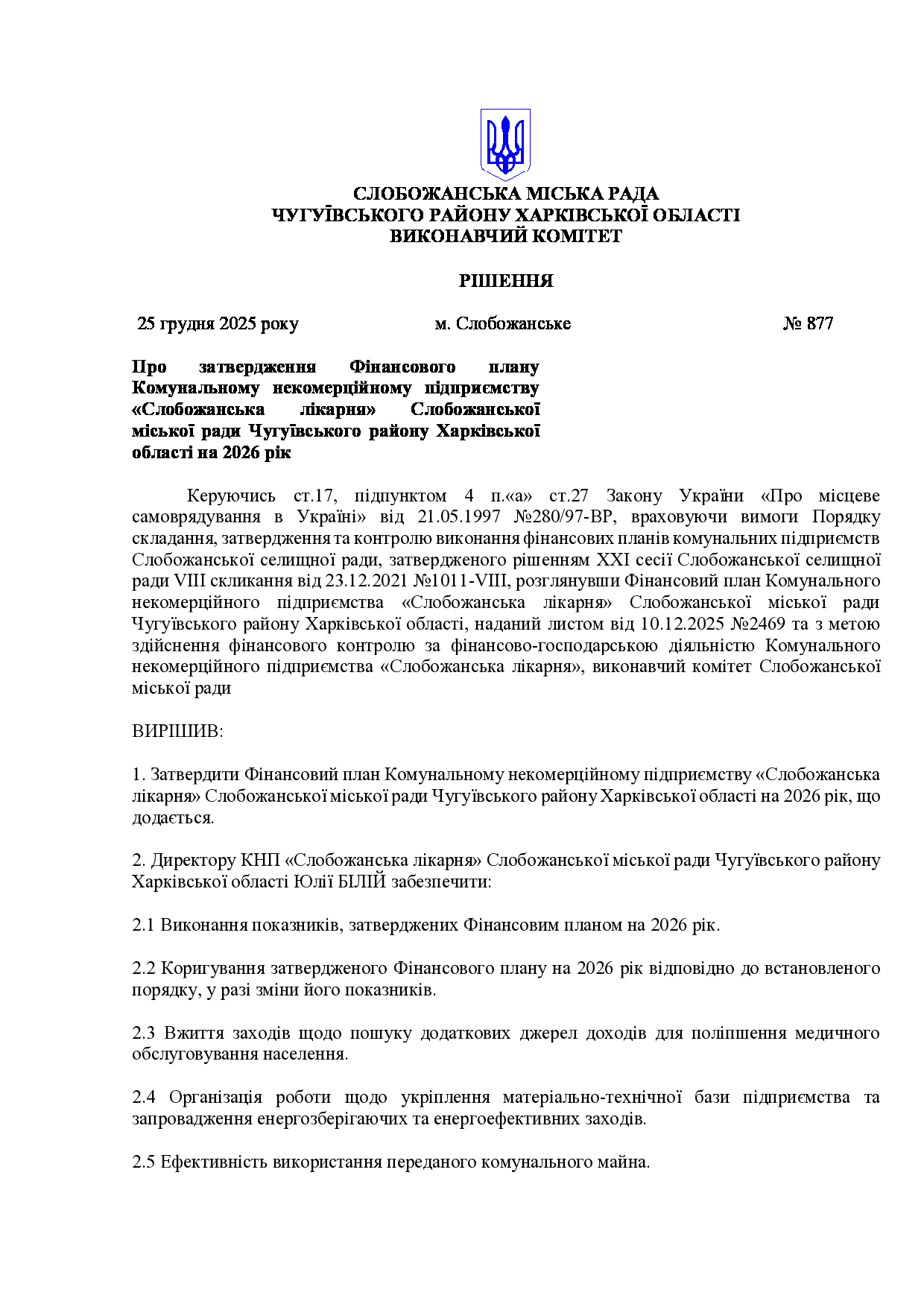 Рішення виконавчого комітету №877 Про затвердження Фінансового плану Комунальному некомерційному підприємству «Слобожанська лікарня» Слобожанської міської ради Чугуївського району Харківської області на 2026 рік.