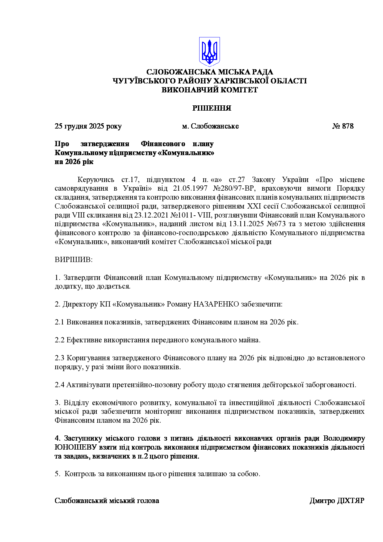 Рішення виконавчого комітету №878 Про затвердження Фінансового плану Комунальному підприємству «Комунальник» на 2026 рік.