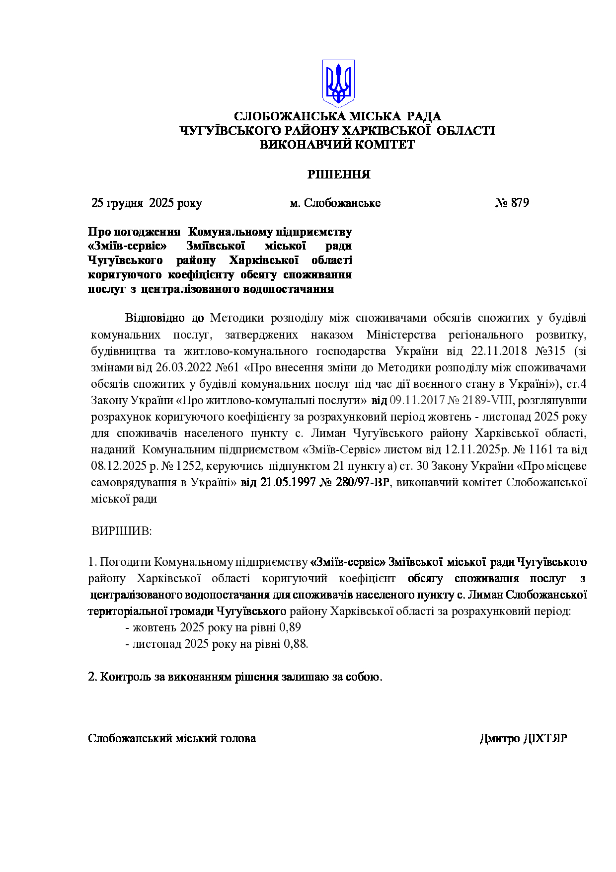 Рішення виконавчого комітету №879 Про погодження Комунальному підприємству «Зміїв-сервіс» Зміївської міської ради Чугуївського району Харківської області коригуючого коефіцієнту обсягу споживання послуг з централізованого водопостачання.