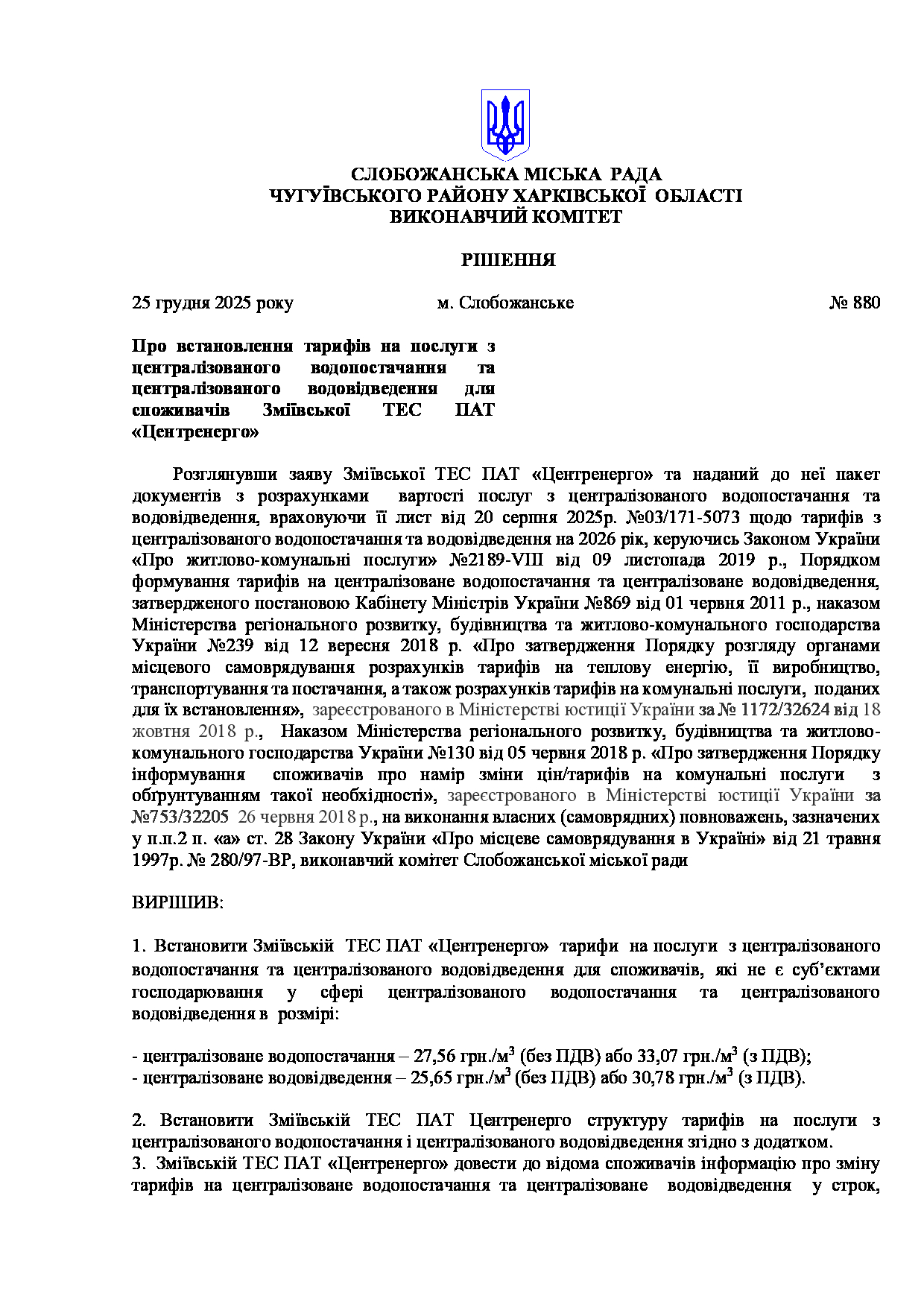 Рішення виконавчого комітету №880 Про встановлення тарифів на послуги з централізованого водопостачання та централізованого водовідведення для споживачів Зміївської ТЕС ПАТ «Центренерго».