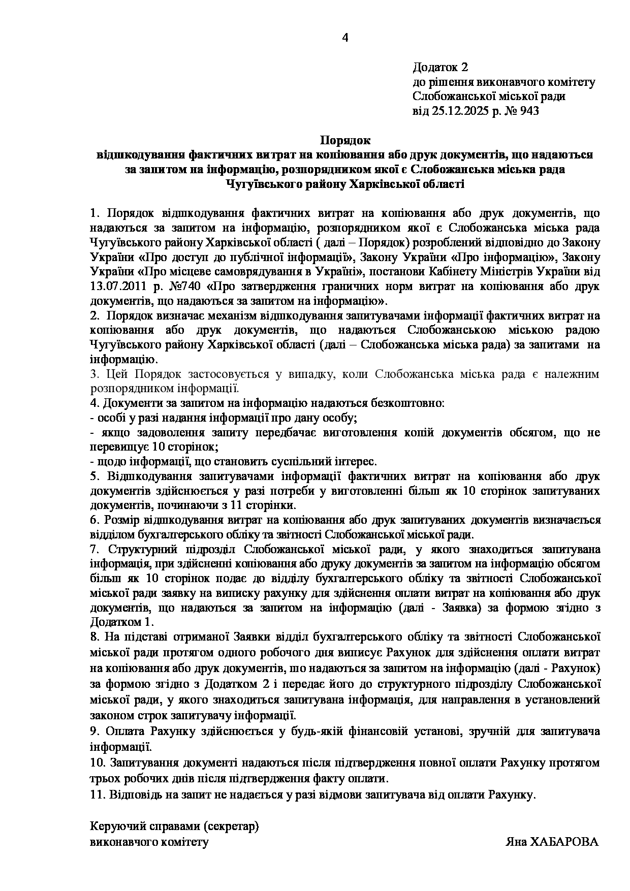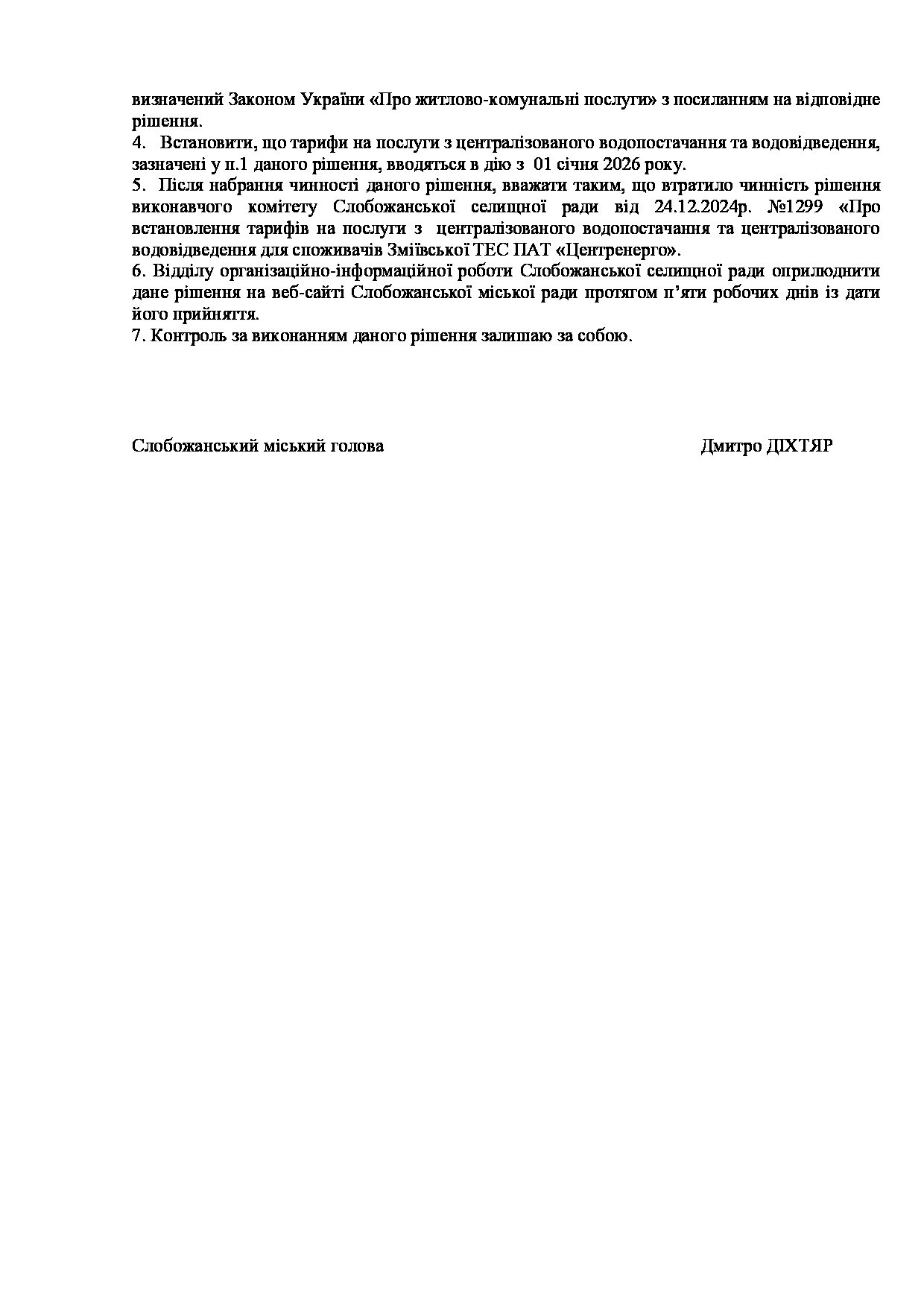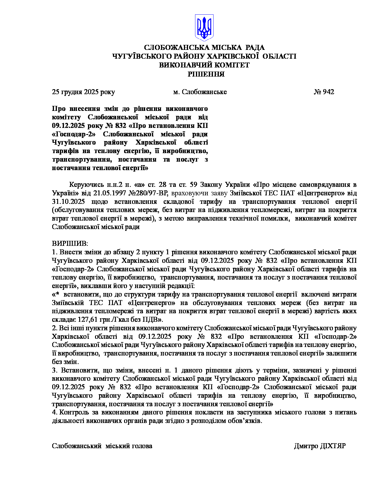 Рішення виконавчого комітету №942 Про внесення змін до рішення виконавчого комітету Слобожанської міської ради від 09.12.2025 року № 832 «Про встановлення КП «Господар-2» Слобожанської міської ради Чугуївського району Харківської області тарифів на теплову енергію, її виробництво, транспортування, постачання та послуг з постачання теплової енергії».