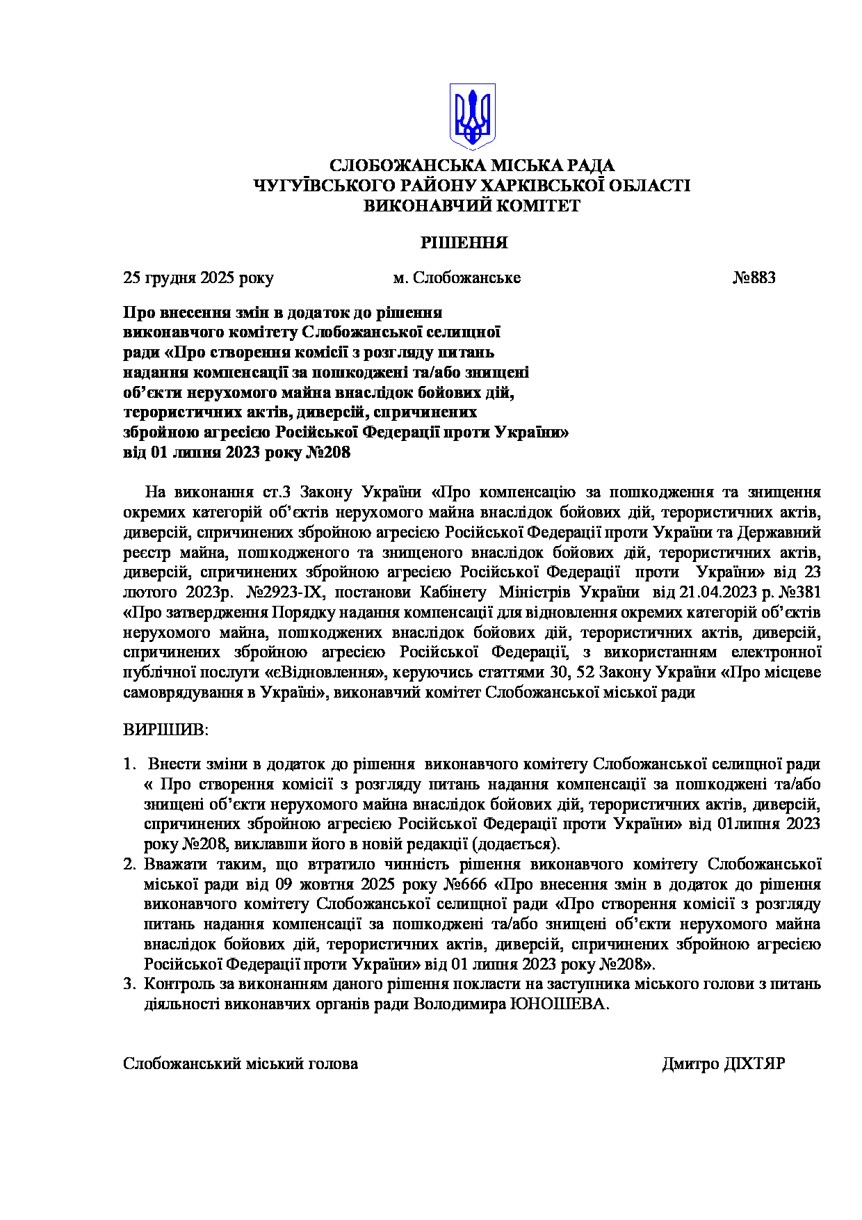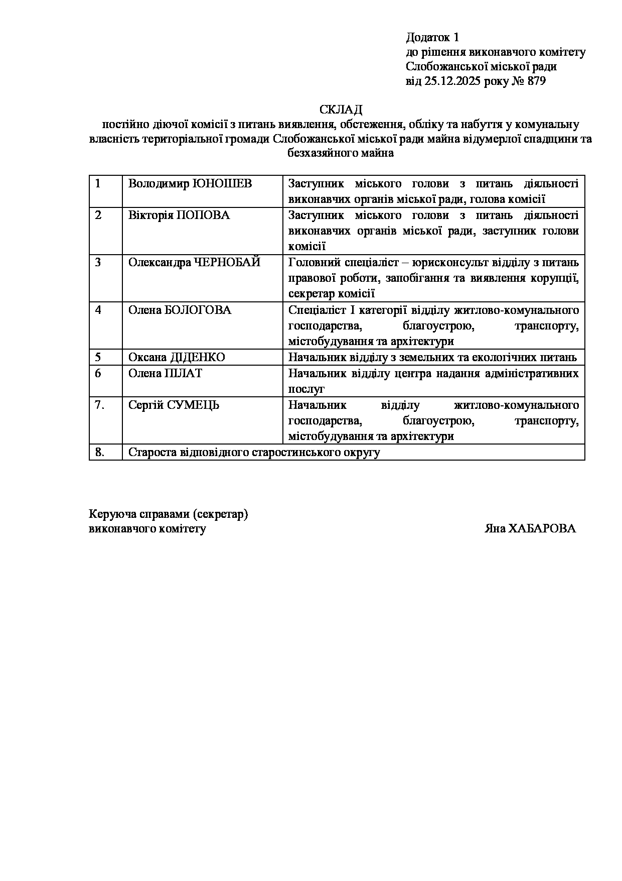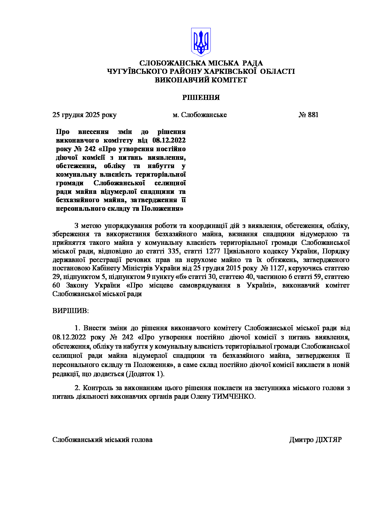Рішення виконавчого комітету №881 Про внесення змін до рішення виконавчого комітету від 08.12.2022 року № 242 «Про утворення постійно діючої комісії з питань виявлення, обстеження, обліку та набуття у комунальну власність територіальної громади Слобожанської селищної ради майна відумерлої спадщини та безхазяйного майна, затвердження її персонального складу та Положення».