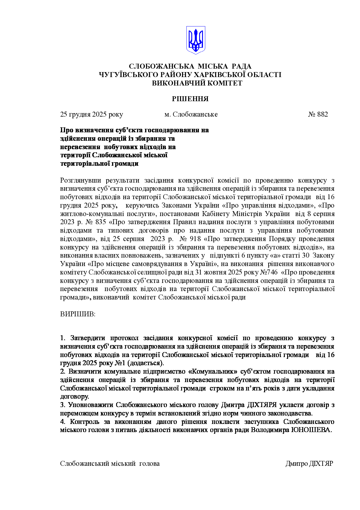 Рішення виконавчого комітету №882 Про визначення суб’єкта господарювання на здійснення операцій із збирання та перевезення побутових відходів на території Слобожанської міської територіальної громади.