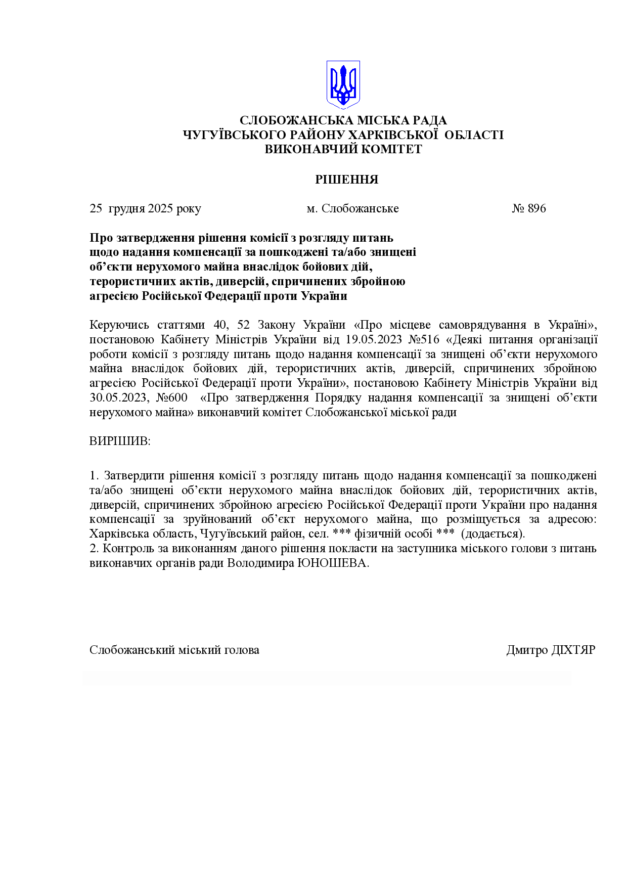 Рішення виконавчого комітету №896 Про затвердження рішення комісії з розгляду питань щодо надання компенсації за пошкоджені та/або знищені об’єкти нерухомого майна внаслідок бойових дій, терористичних актів, диверсій, спричинених збройною агресією Російської Федерації проти України.