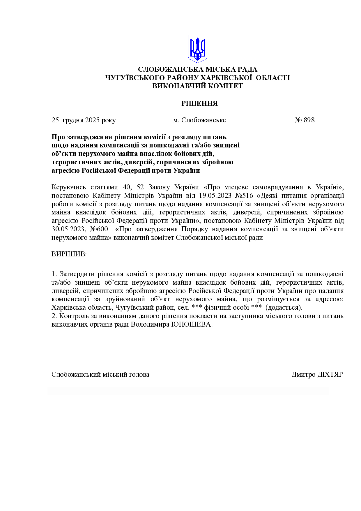 Рішення виконавчого комітету №898 Про затвердження рішення комісії з розгляду питань щодо надання компенсації за пошкоджені та/або знищені об’єкти нерухомого майна внаслідок бойових дій, терористичних актів, диверсій, спричинених збройною агресією Російської Федерації проти України.