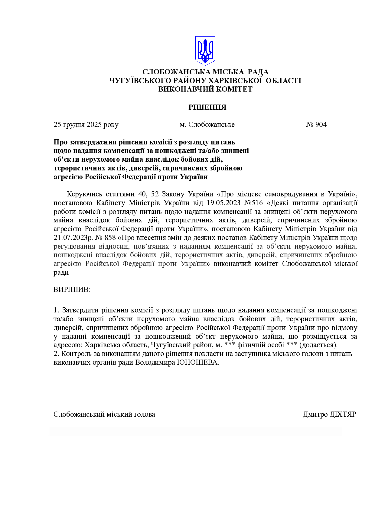 Рішення виконавчого комітету №904 Про затвердження рішення комісії з розгляду питань щодо надання компенсації за пошкоджені та/або знищені об’єкти нерухомого майна внаслідок бойових дій, терористичних актів, диверсій, спричинених збройною агресією Російської Федерації проти України.