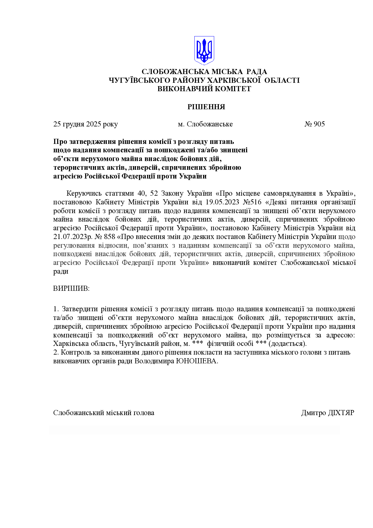 Рішення виконавчого комітету №905 Про затвердження рішення комісії з розгляду питань щодо надання компенсації за пошкоджені та/або знищені об’єкти нерухомого майна внаслідок бойових дій, терористичних актів, диверсій, спричинених збройною агресією Російської Федерації проти України.