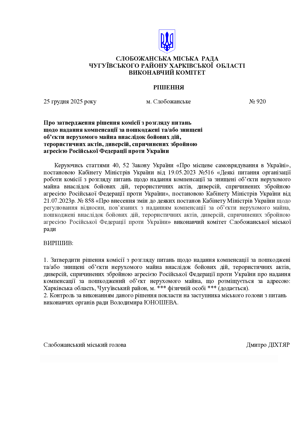 Рішення виконавчого комітету №920 Про затвердження рішення комісії з розгляду питань щодо надання компенсації за пошкоджені та/або знищені об’єкти нерухомого майна внаслідок бойових дій, терористичних актів, диверсій, спричинених збройною агресією Російської Федерації проти України.