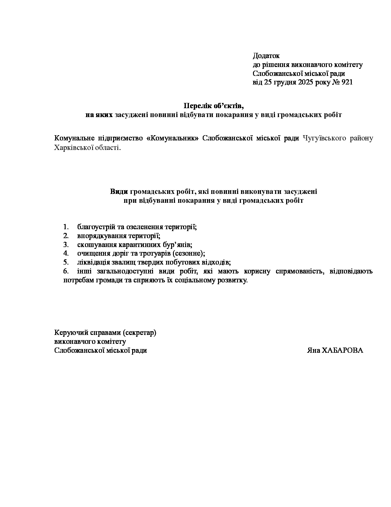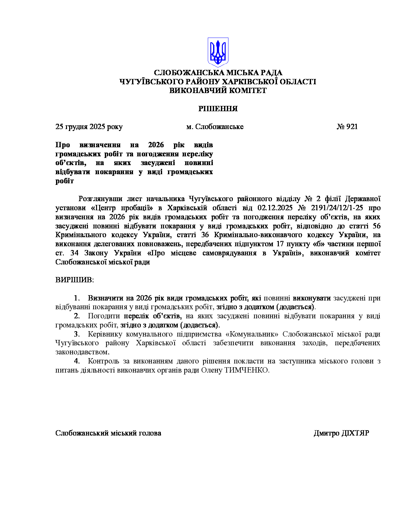 Рішення виконавчого комітету №921 Про визначення на 2026 рік видів громадських робіт та погодження переліку об’єктів, на яких засуджені повинні відбувати покарання у виді громадських робіт.