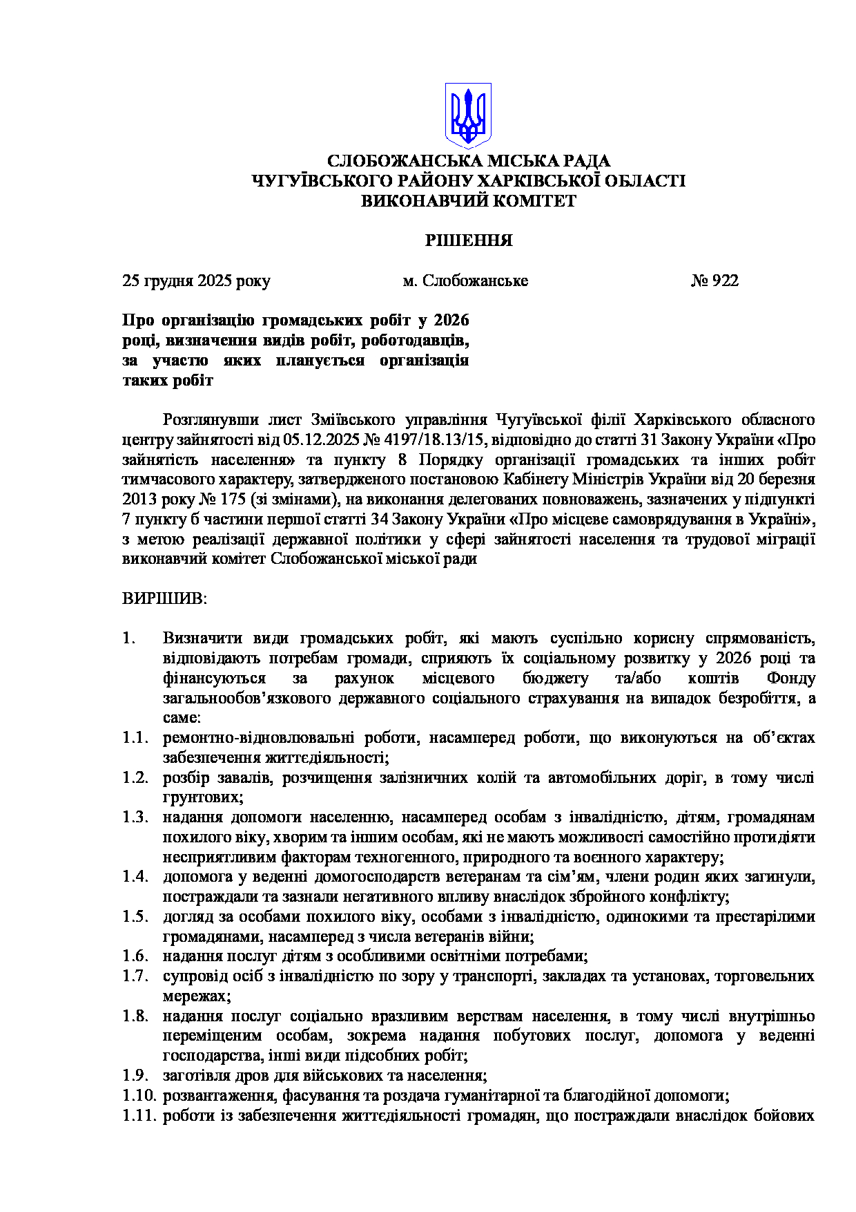 Рішення виконавчого комітету №922 Про організацію громадських робіт у 2026 році, визначення видів робіт, роботодавців, за участю яких планується організація таких робіт.