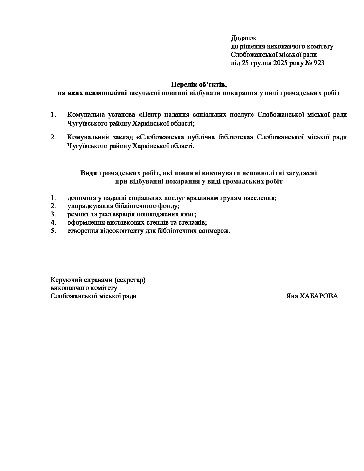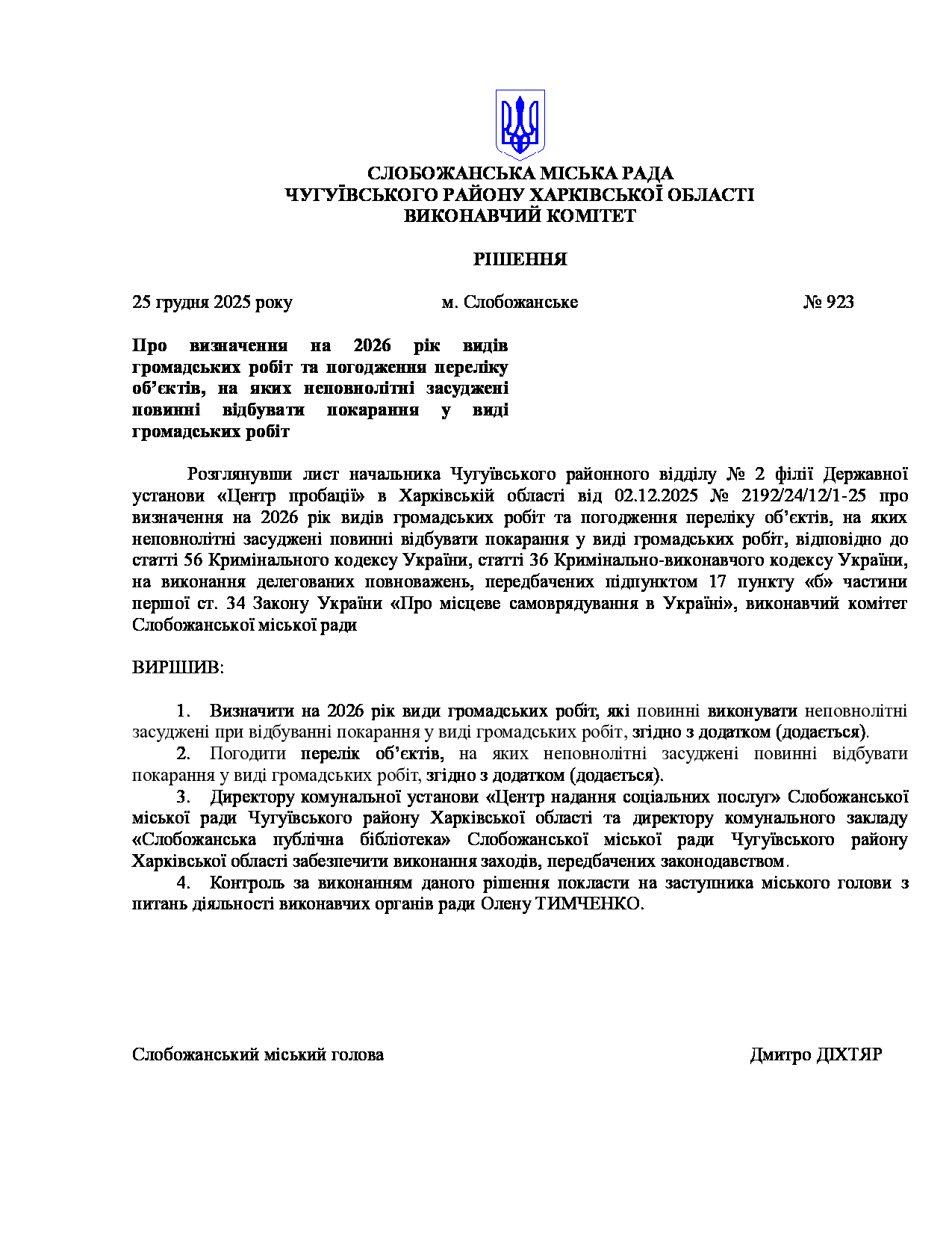 Рішення виконавчого комітету №923 Про визначення на 2026 рік видів громадських робіт та погодження переліку об’єктів, на яких неповнолітні засуджені повинні відбувати покарання у виді громадських робіт.