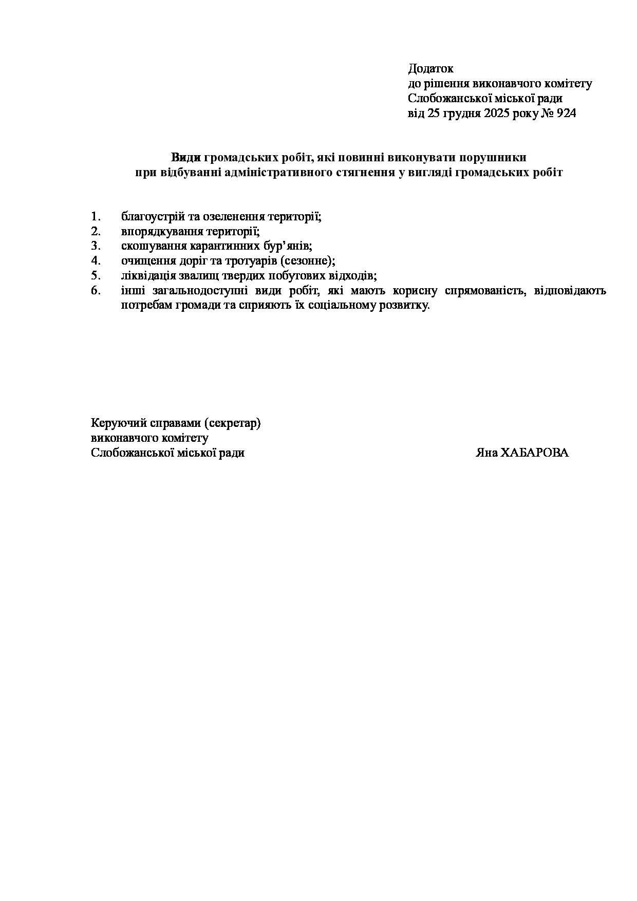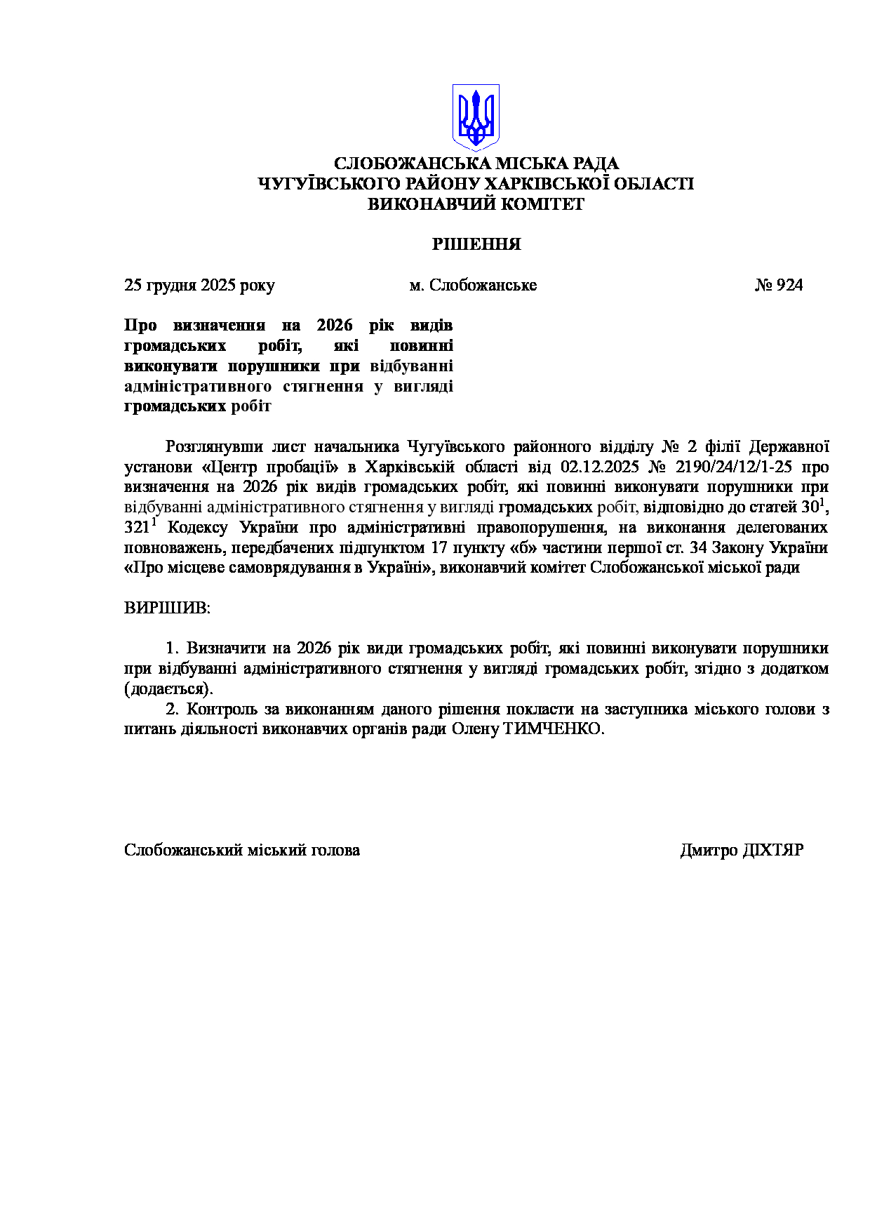Рішення виконавчого комітету №924 Про визначення на 2026 рік видів громадських робіт, які повинні виконувати порушники при відбуванні адміністративного стягнення у вигляді громадських робіт.