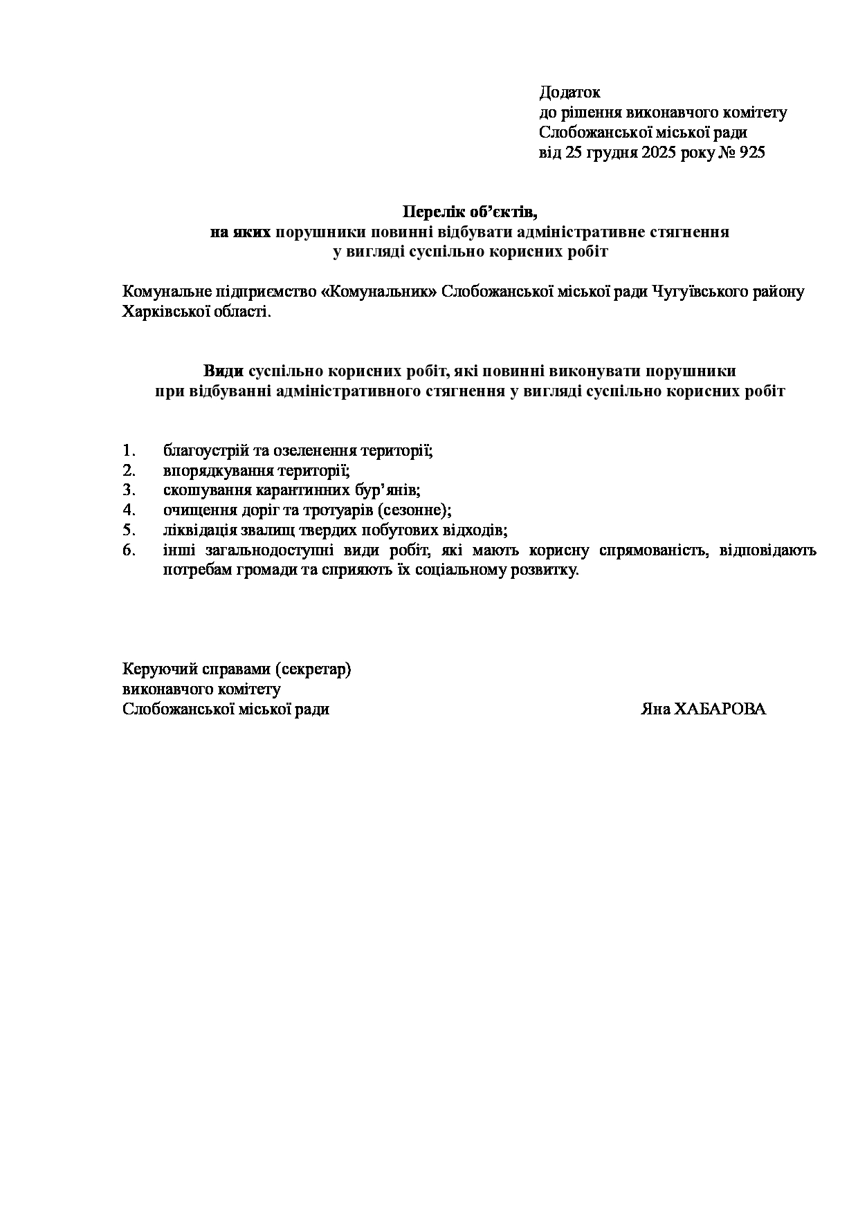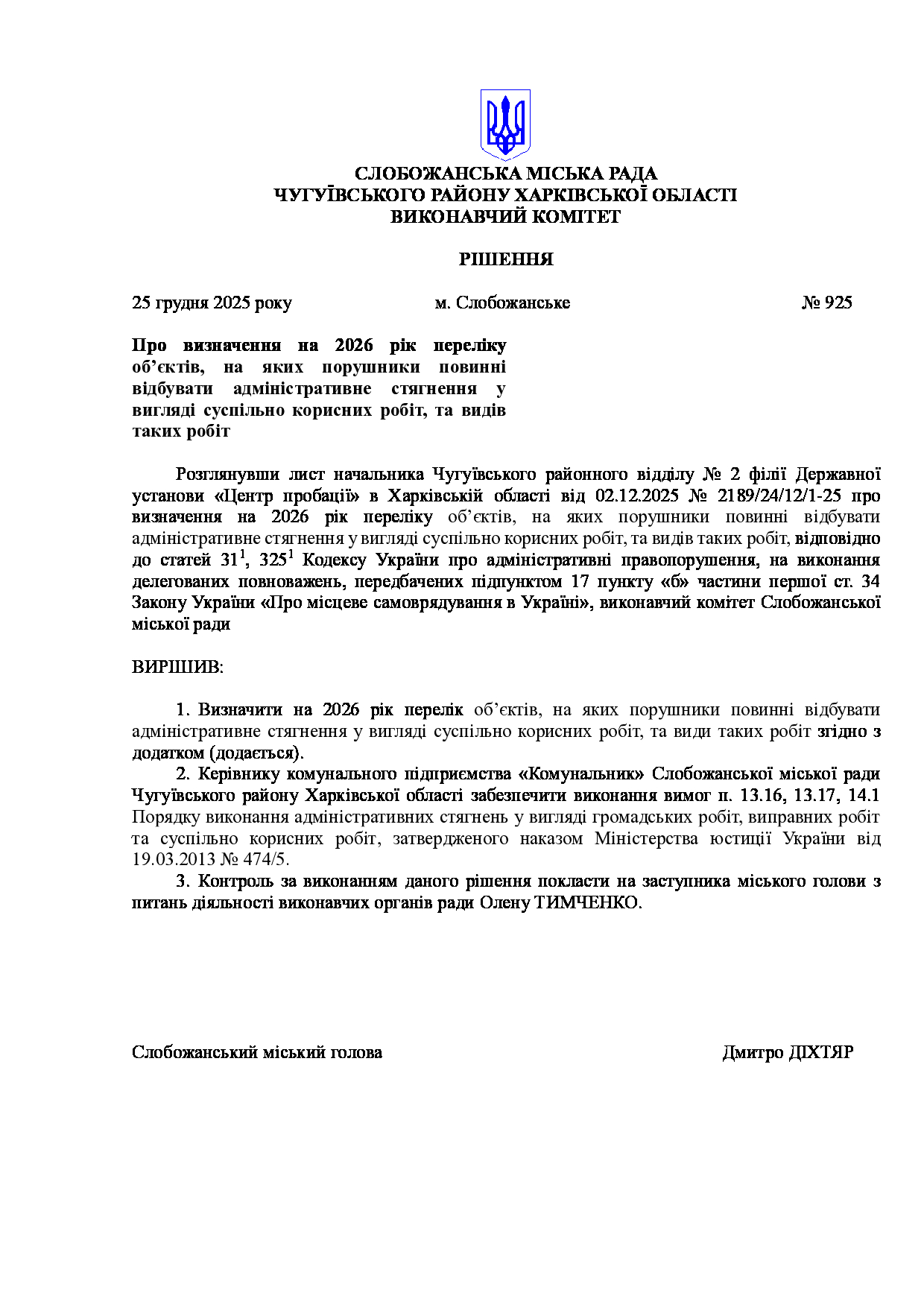 Рішення виконавчого комітету №925 Про визначення на 2026 рік переліку об’єктів, на яких порушники повинні відбувати адміністративне стягнення у вигляді суспільно корисних робіт, та видів таких робіт.