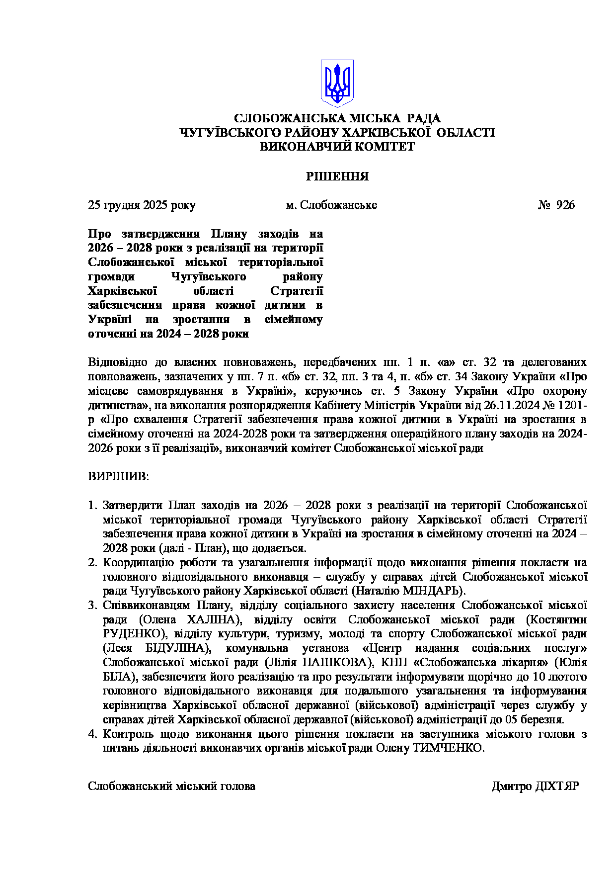 Рішення виконавчого комітету №926 Про затвердження Плану заходів на 2026-2028 роки з реалізації на території Слобожанської міської територіальної громади Чугуївського району Харківської області Стратегії забезпечення права кожної дитини в Україні на зростання в сімейному оточенні на 2024-2028 роки.