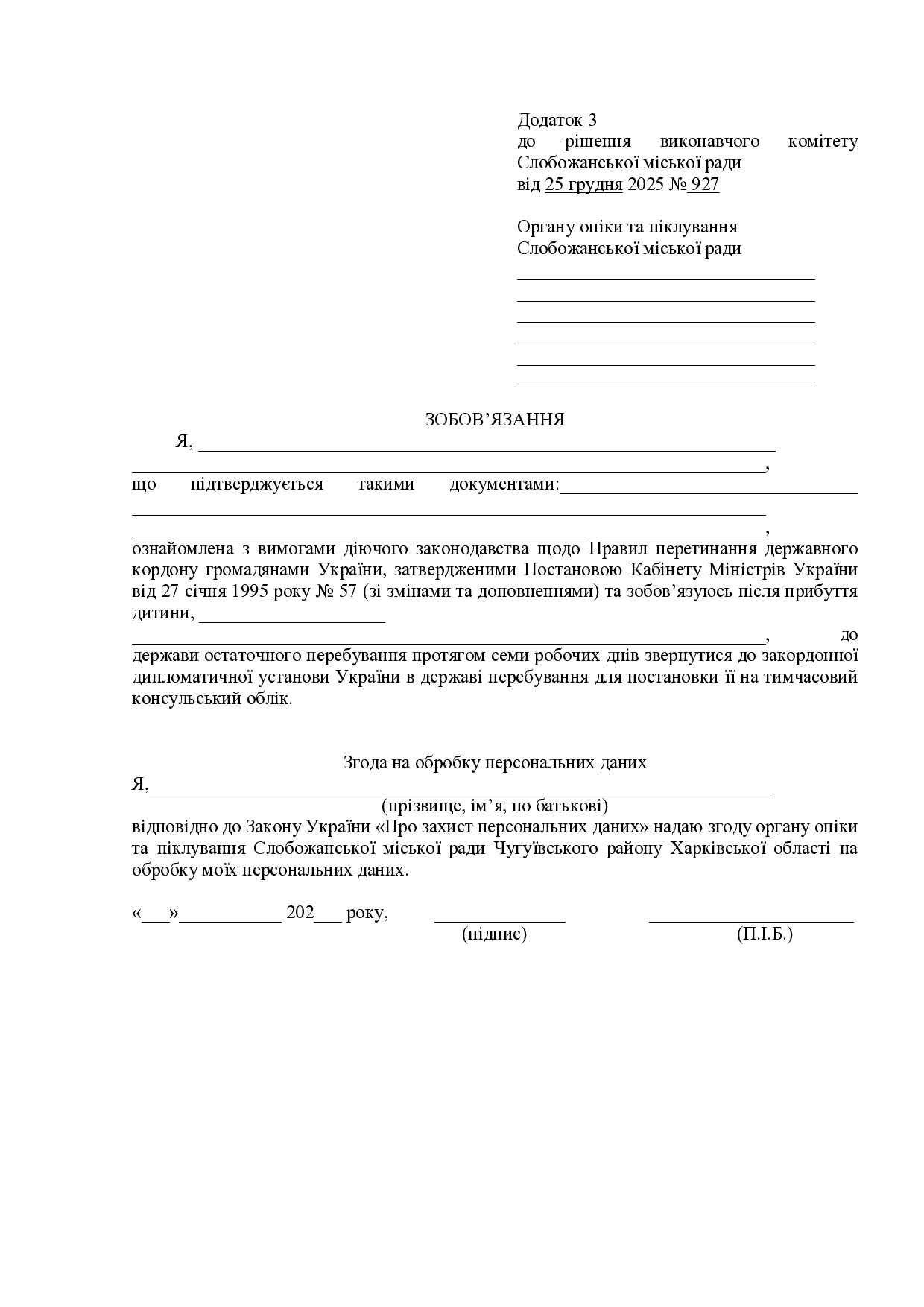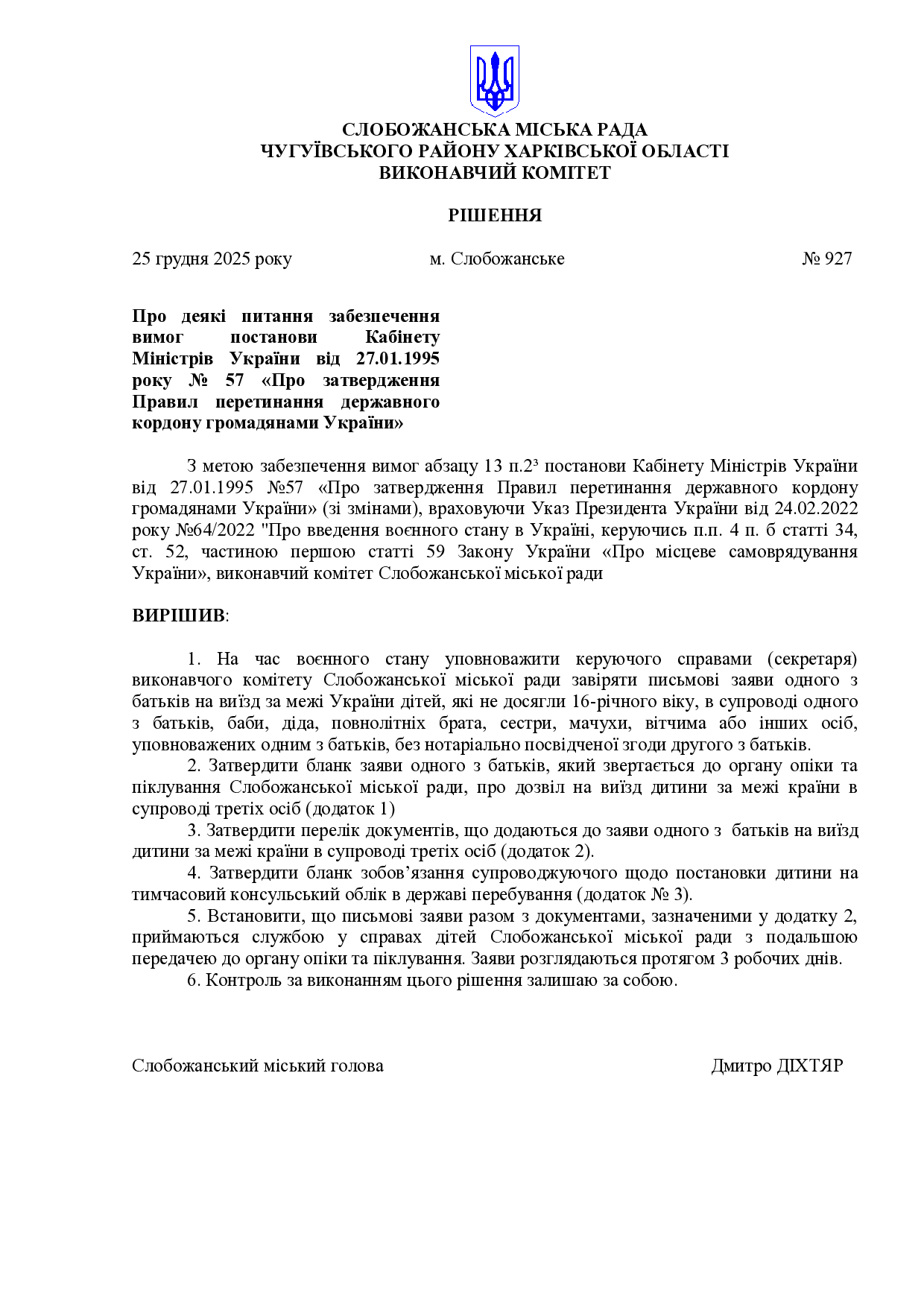 Рішення виконавчого комітету №927 Про деякі питання забезпечення вимог постанови Кабінету Міністрів України від 27.01.1995 року № 57 «Про затвердження Правил перетинання державного кордону громадянами України».