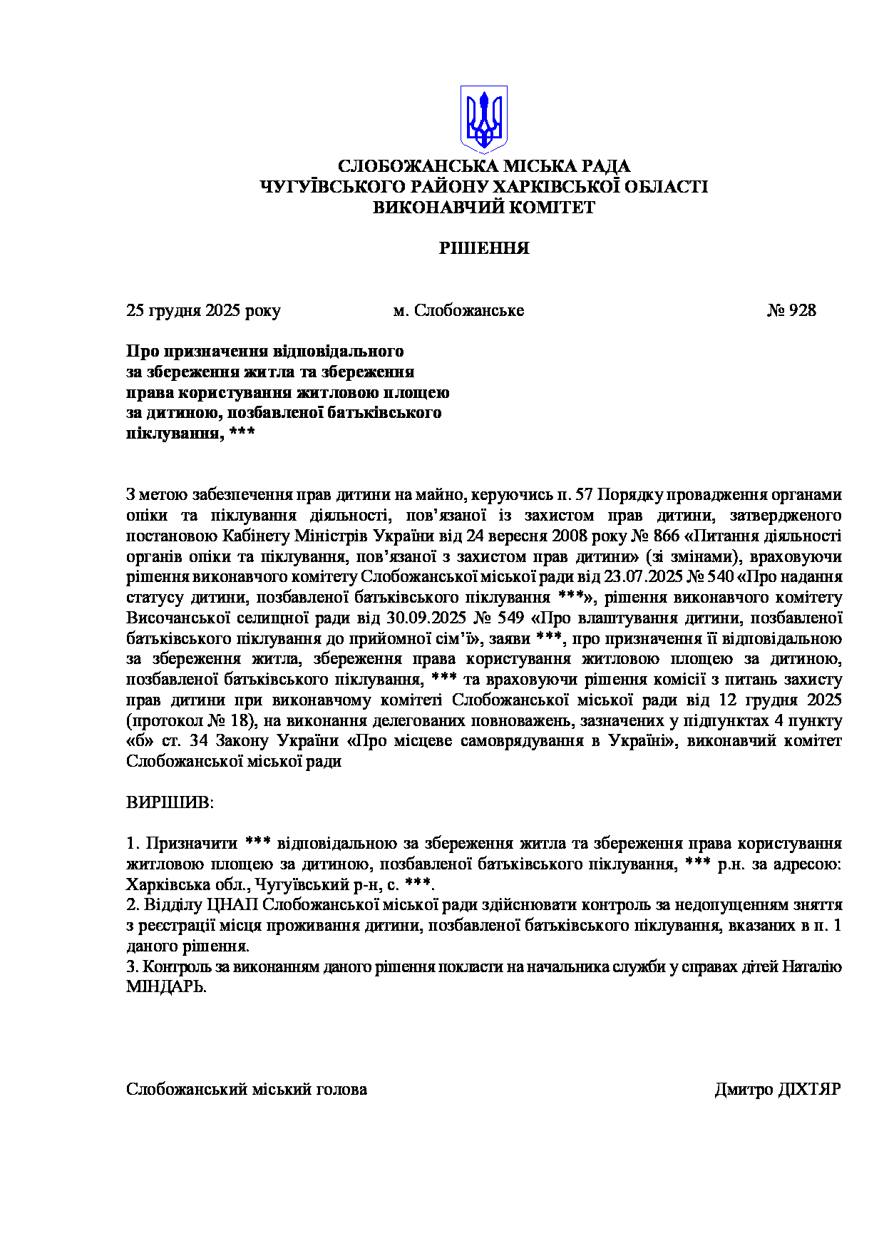 Рішення виконавчого комітету №928 Про призначення відповідального за збереження житла за дитиною, позбавленої батьківського піклування ***.
