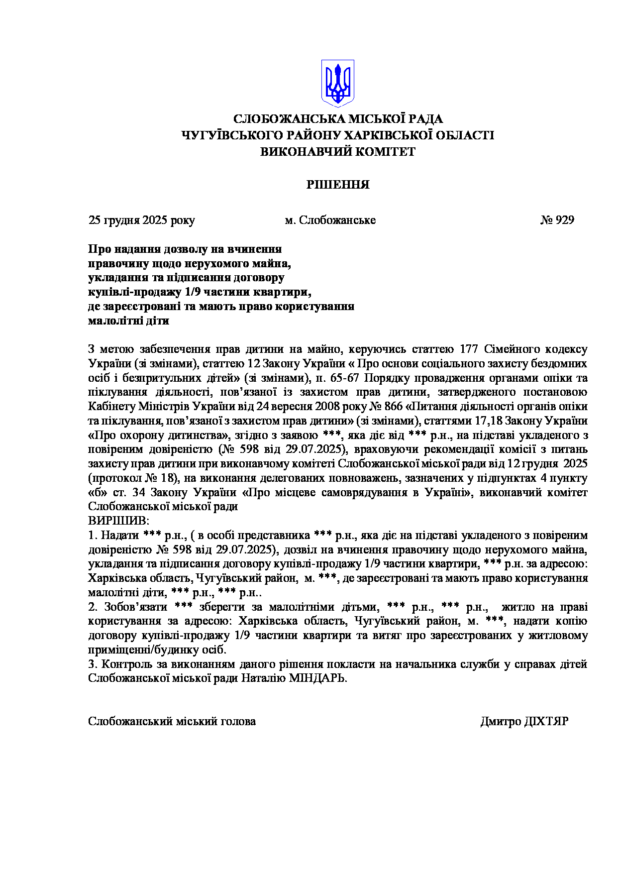 Рішення виконавчого комітету №929 Про надання дозволу на вчинення правочину щодо нерухомого майна, укладання та підписання договору купівлі-продажу 1/9 частини квартири, де зареєстровані та мають право користування малолітні діти *** р.н., ***.