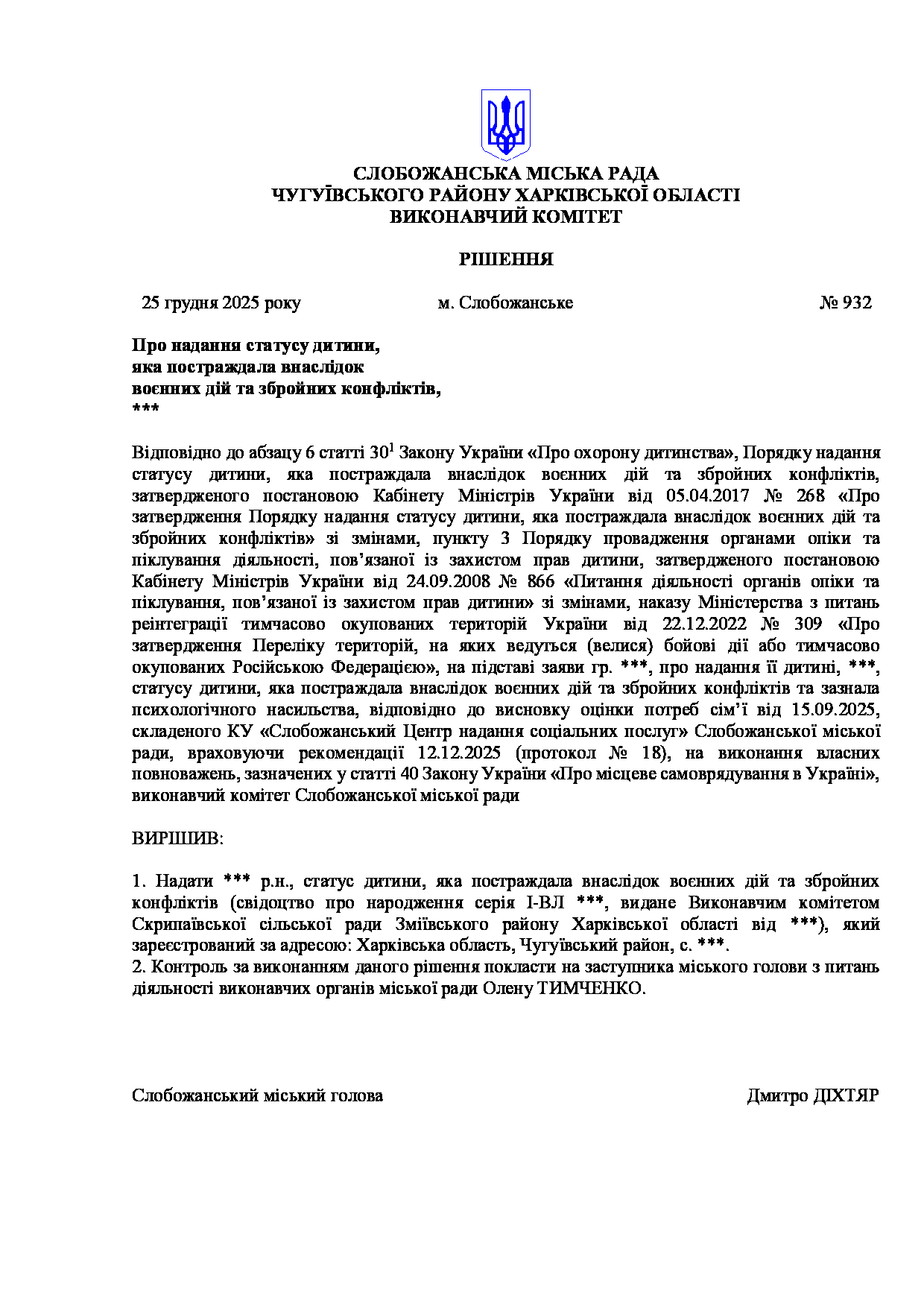 Рішення виконавчого комітету №932 Про надання статусу дитини, яка постраждала внаслідок воєнних дій та збройних конфліктів, ***.