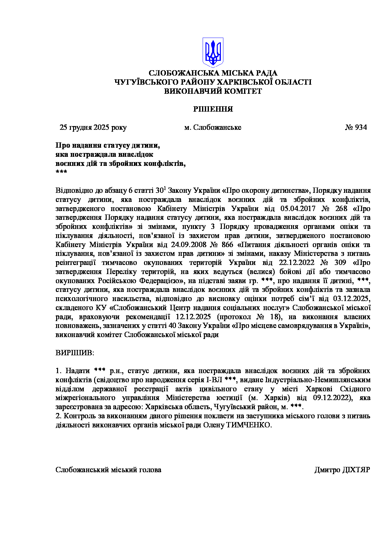 Рішення виконавчого комітету №934 Про надання статусу дитини, яка постраждала внаслідок воєнних дій та збройних конфліктів, ***.