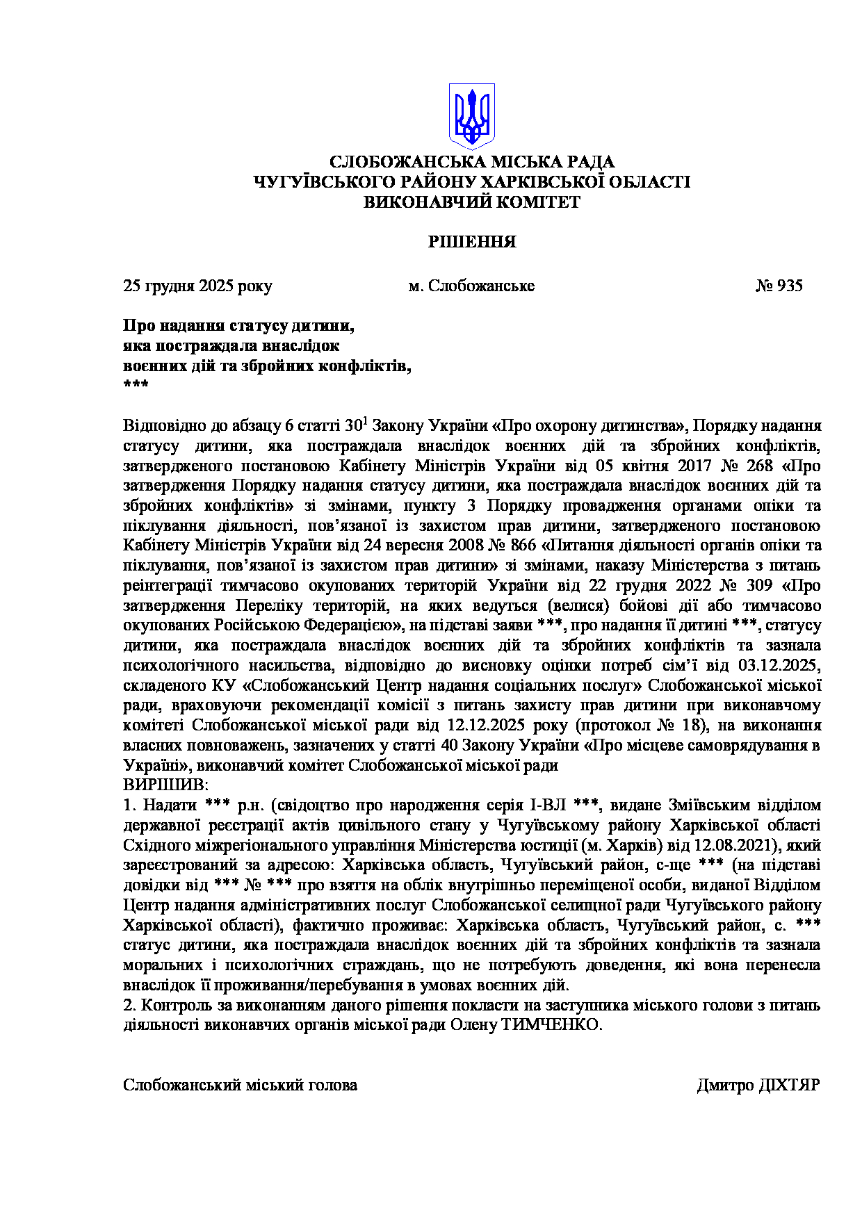 Рішення виконавчого комітету №935 Про надання статусу дитини, яка постраждала внаслідок воєнних дій та збройних конфліктів, ***.