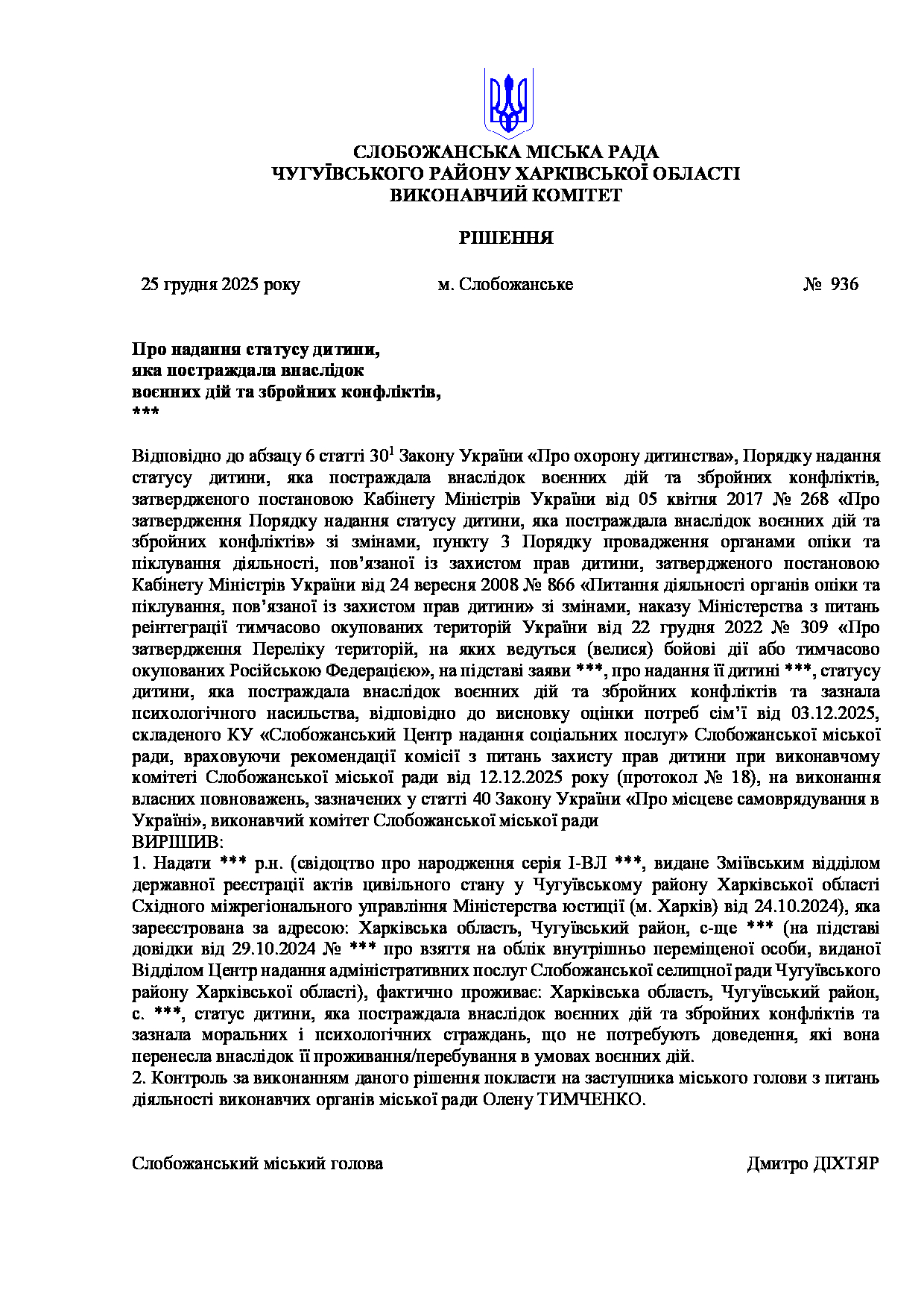 Рішення виконавчого комітету №936 Про надання статусу дитини, яка постраждала внаслідок воєнних дій та збройних конфліктів, ***.