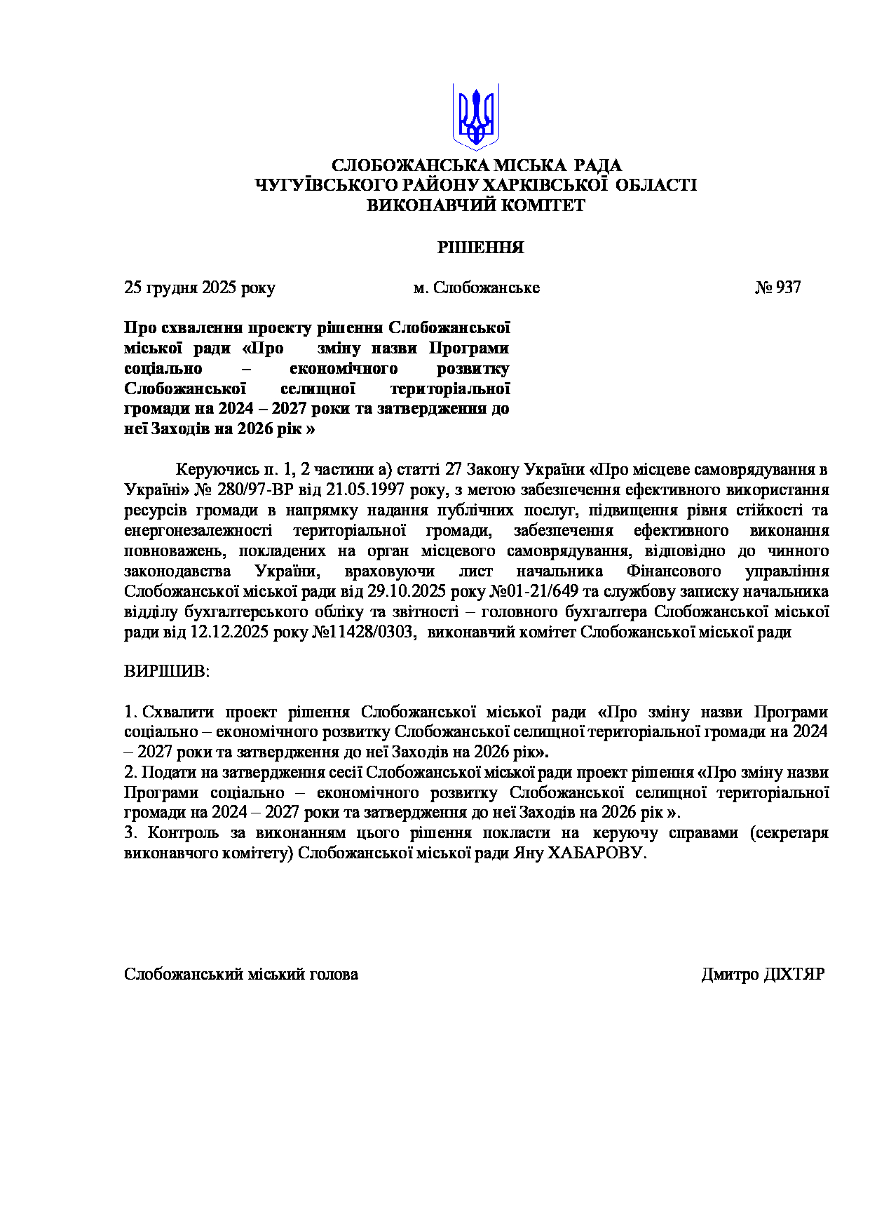 Рішення виконавчого комітету №937 Про схвалення проекту рішення Слобожанської міської ради «Про зміну назви Програми соціально – економічного розвитку Слобожанської селищної територіальної громади на 2024 – 2027 роки та затвердження до неї Заходів на 2026 рік».