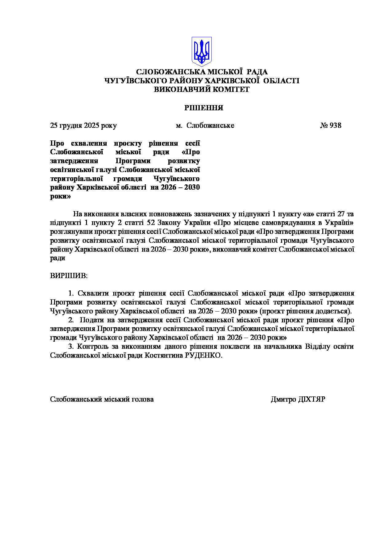 Рішення виконавчого комітету №938 Про схвалення проєкту рішення сесії Слобожанської міської ради «Про затвердження Програми розвитку освітянської галузі Слобожанської міської територіальної громади Чугуївського району Харківської області на 2026 – 2030 роки».