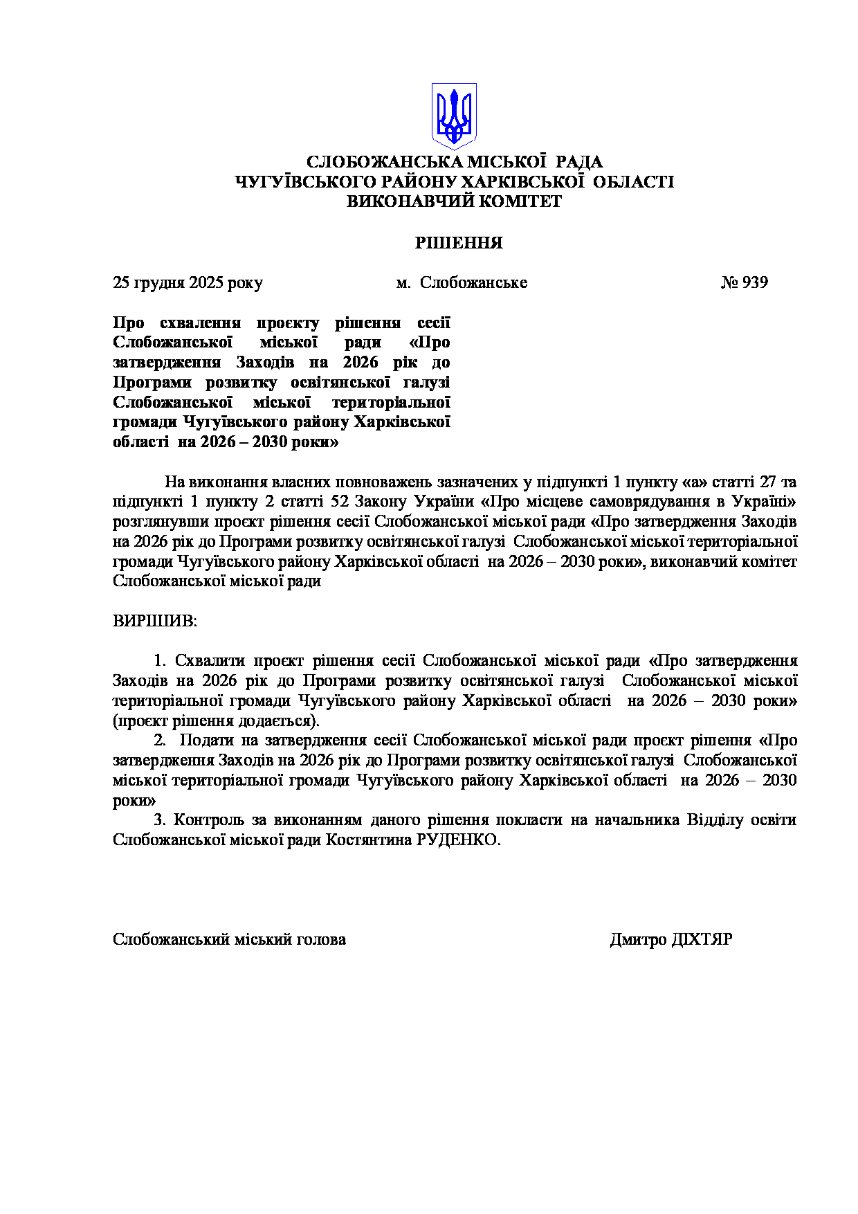 Рішення виконавчого комітету №939 Про схвалення проєкту рішення сесії Слобожанської міської ради «Про затвердження Заходів на 2026 рік до Програми розвитку освітянської галузі Слобожанської міської територіальної громади Чугуївського району Харківської області на 2026 – 2030 роки».
