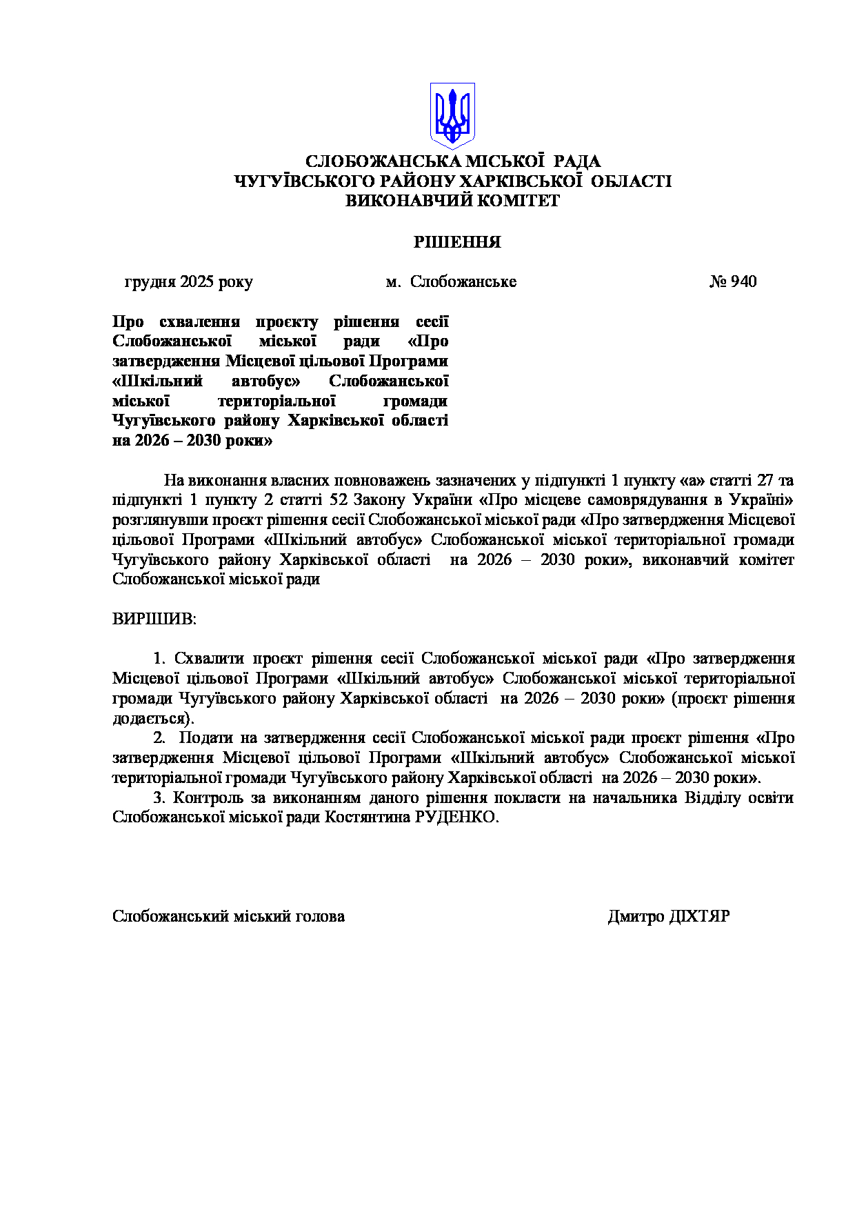 Рішення виконавчого комітету №940 Про схвалення проєкту рішення сесії Слобожанської міської ради «Про затвердження Місцевої цільової Програми «Шкільний автобус» Слобожанської міської територіальної громади Чугуївського району Харківської області на 2026 – 2030 роки».