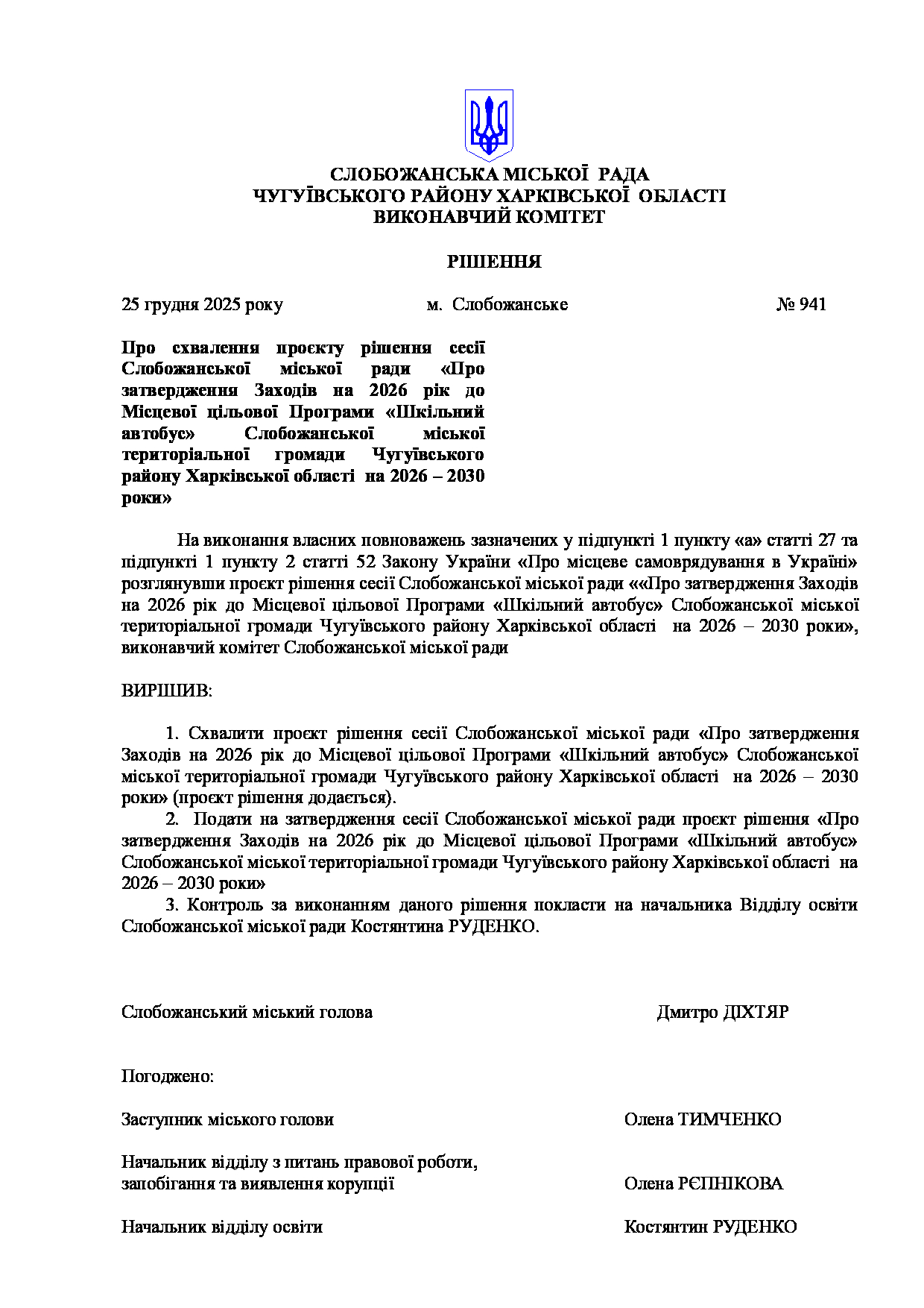Рішення виконавчого комітету №941 Про схвалення проєкту рішення сесії Слобожанської міської ради «Про затвердження Заходів на 2026 рік до Місцевої цільової Програми «Шкільний автобус» Слобожанської міської територіальної громади Чугуївського району Харківської області на 2026 – 2030 роки».