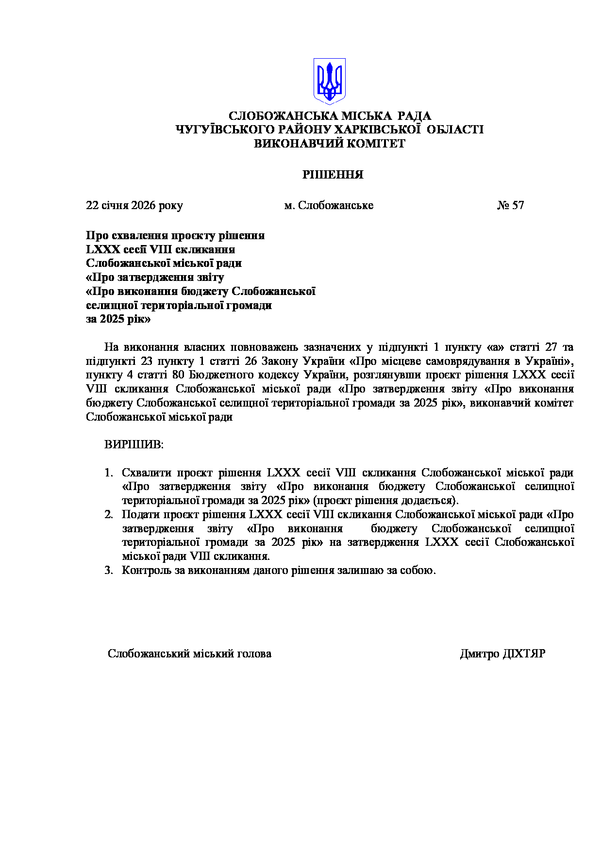 Рішення виконавчого комітету №57 Про схвалення проєкту рішення LXХХ сесії VIII скликання Слобожанської міської ради «Про затвердження звіту «Про виконання бюджету Слобожанської селищної територіальної громади за 2025 рік».