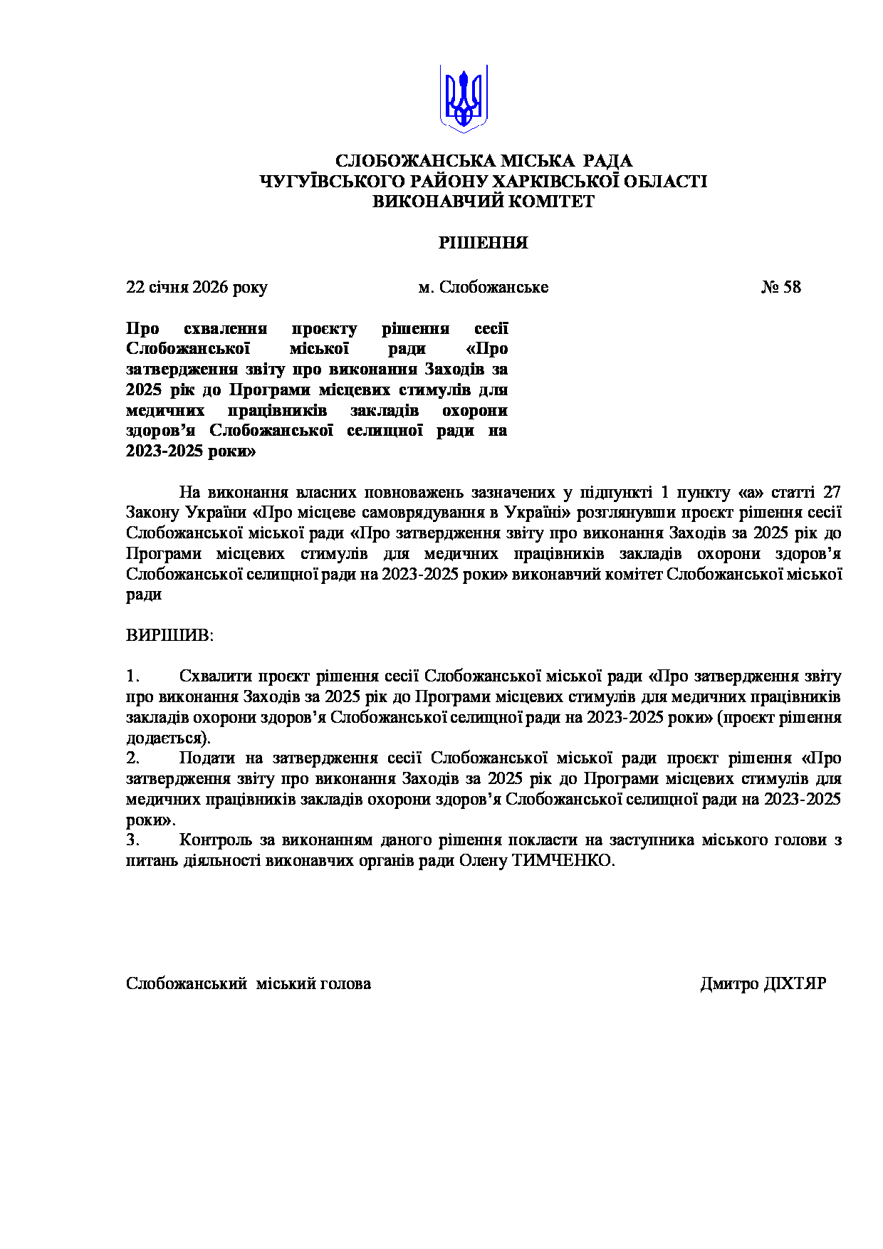 Рішення виконавчого комітету №58 Про схвалення проєкту рішення сесії Слобожанської міської ради «Про затвердження звіту про виконання Заходів за 2025 рік до Програми місцевих стимулів для медичних працівників закладів охорони здоров’я Слобожанської селищної ради на 2023-2025 роки».