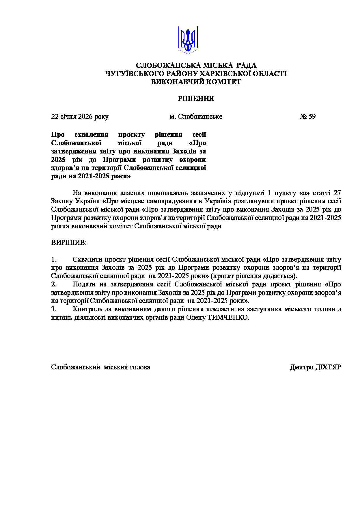 Рішення виконавчого комітету №59 Про схвалення проєкту рішення сесії Слобожанської міської ради «Про затвердження звіту про виконання Заходів за 2025 рік до Програми розвитку охорони здоров’я на території Слобожанської селищної ради на 2021-2025 роки».