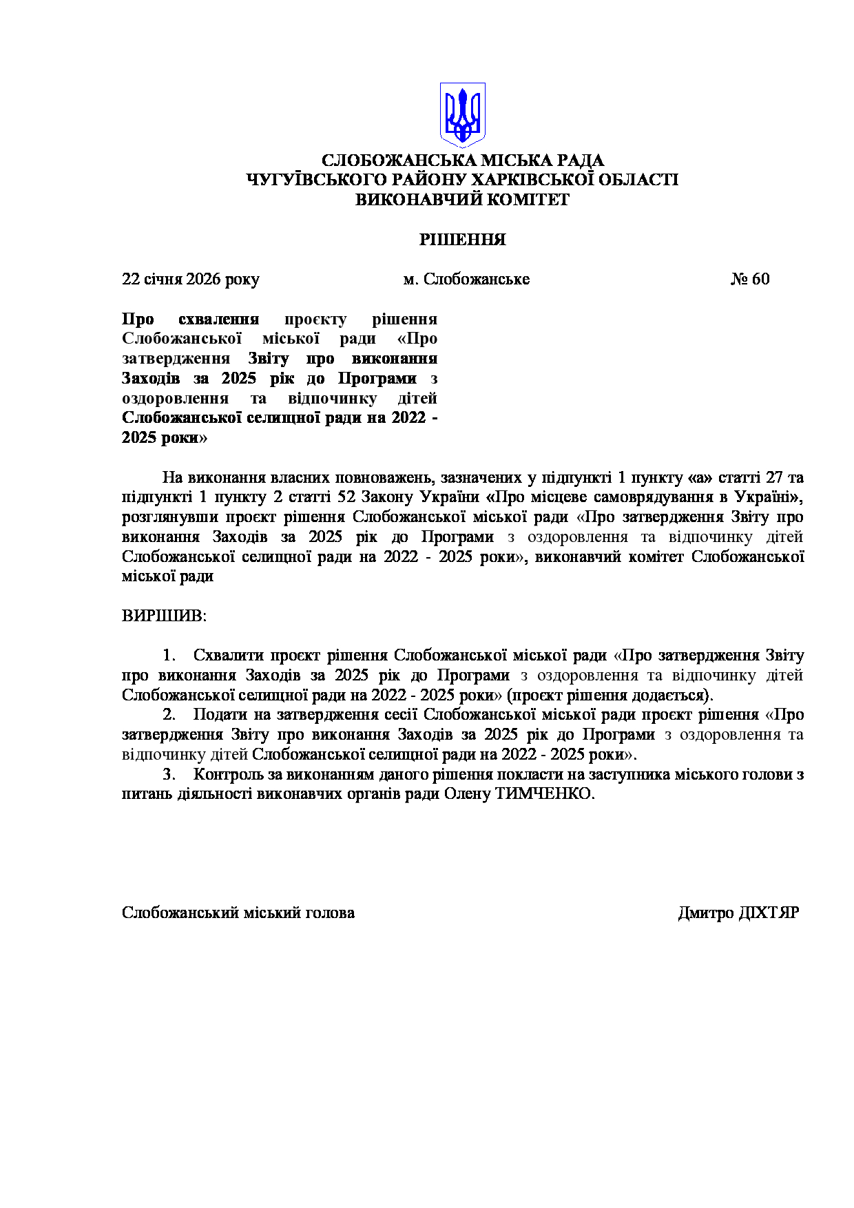 Рішення виконавчого комітету №60 Про схвалення проєкту рішення Слобожанської міської ради «Про затвердження Звіту про виконання Заходів за 2025 рік до Програми з оздоровлення та відпочинку дітей Слобожанської селищної ради на 2022 - 2025 роки».