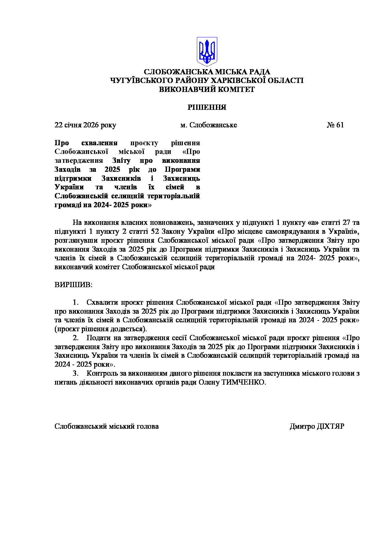 Рішення виконавчого комітету №61 Про схвалення проєкту рішення Слобожанської міської ради «Про затвердження Звіту про виконання Заходів за 2025 рік до Програми підтримки Захисників і Захисниць України та членів їх сімей в Слобожанській селищній територіальній громаді на 2024- 2025 роки».