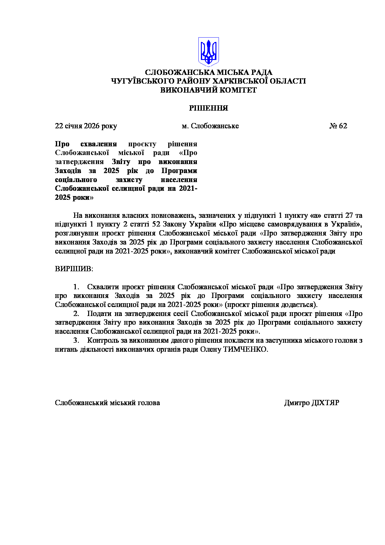 Рішення виконавчого комітету №62 Про схвалення проєкту рішення Слобожанської міської ради «Про затвердження Звіту про виконання Заходів за 2025 рік до Програми соціального захисту населення Слобожанської селищної ради на 2021-2025 роки».