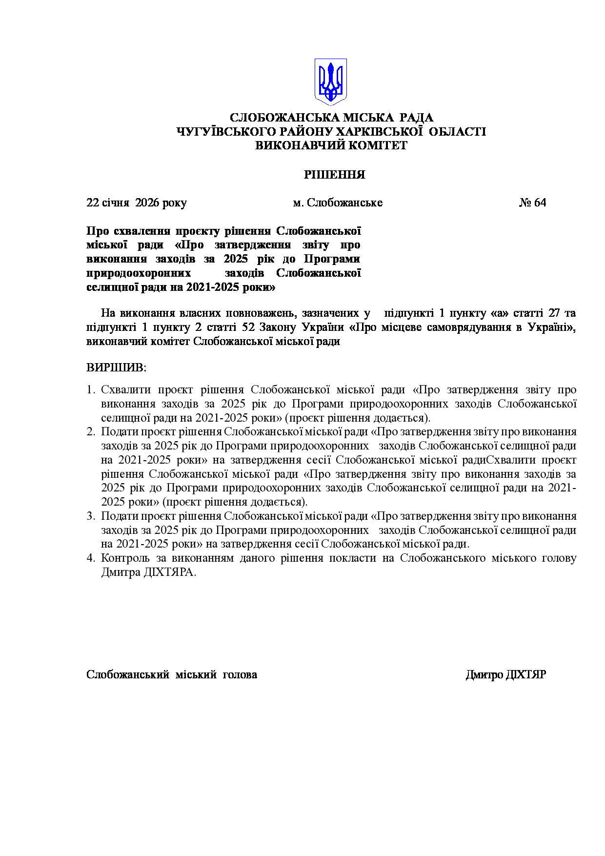 Рішення виконавчого комітету №64 Про схвалення проєкту рішення Слобожанської міської ради «Про затвердження звіту про виконання заходів за 2025 рік до Програми природоохоронних заходів Слобожанської селищної ради на 2021-2025 роки».