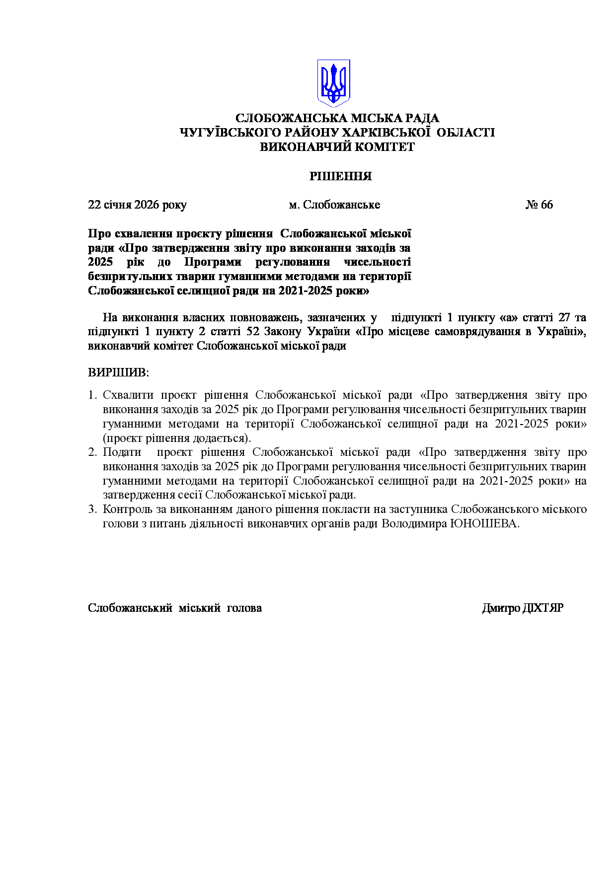 Рішення виконавчого комітету №66 Про схвалення проєкту рішення Слобожанської міської ради «Про затвердження звіту про виконання заходів за 2025 рік до Програми регулювання чисельності безпритульних тварин гуманними методами на території Слобожанської селищної ради на 2021-2025 роки».