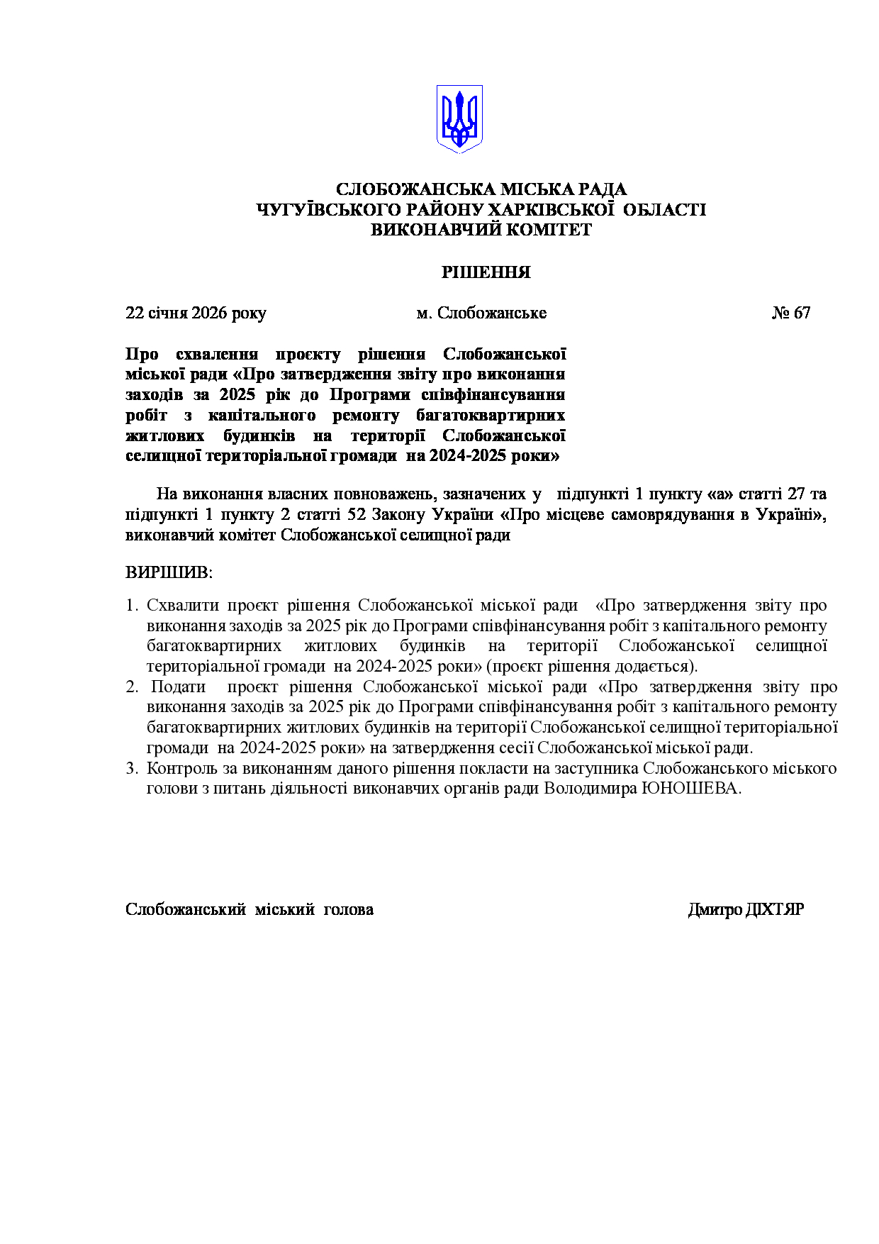 Рішення виконавчого комітету №67 Про схвалення проєкту рішення Слобожанської міської ради «Про затвердження звіту про виконання заходів за 2025 рік до Програми співфінансування робіт з капітального ремонту багатоквартирних житлових будинків на території Слобожанської селищної територіальної громади на 2024-2025 роки».