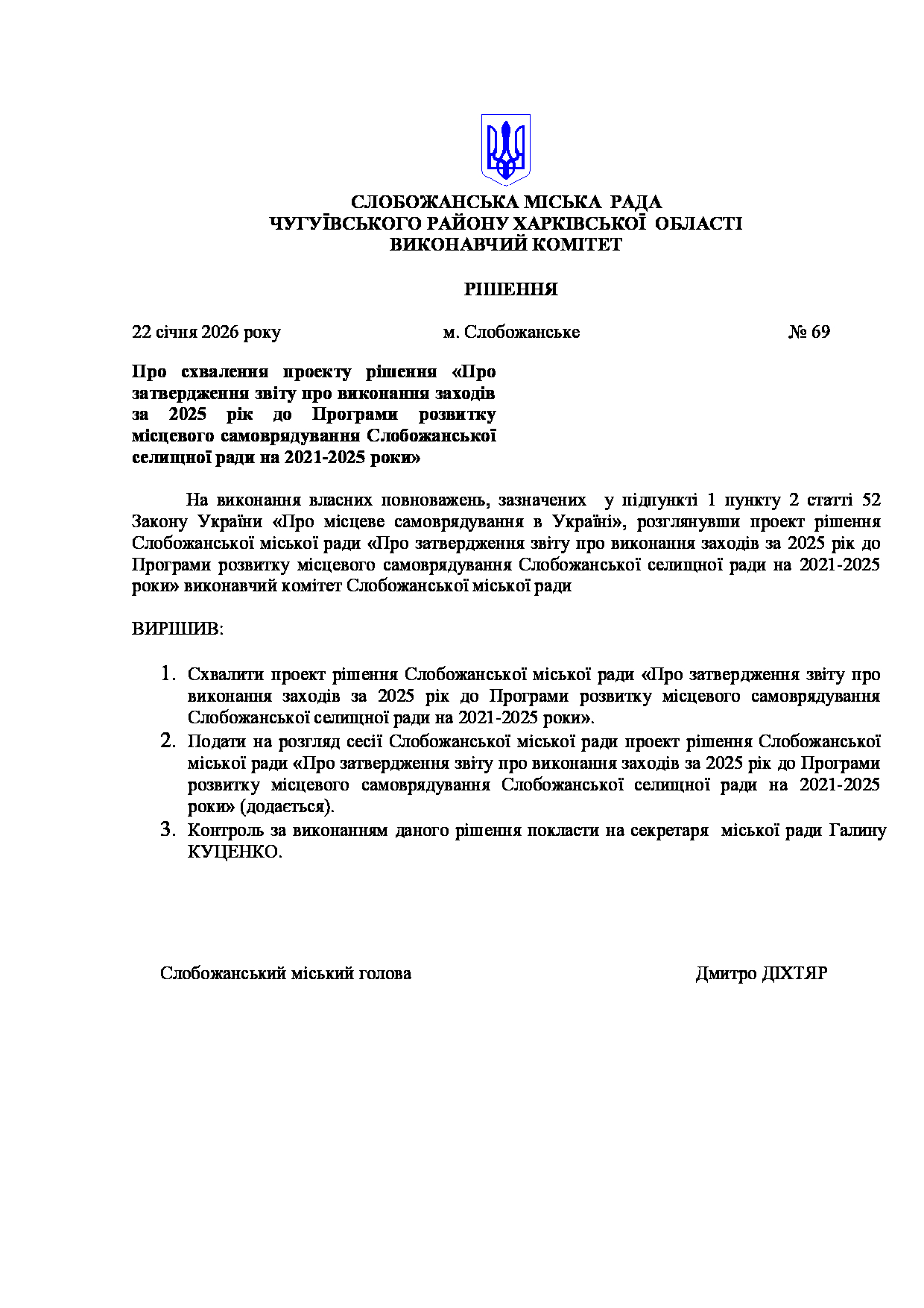 Рішення виконавчого комітету №69 Про схвалення проекту рішення «Про затвердження звіту про виконання заходів за 2025 рік до Програми розвитку місцевого самоврядування Слобожанської селищної ради на 2021-2025 роки».