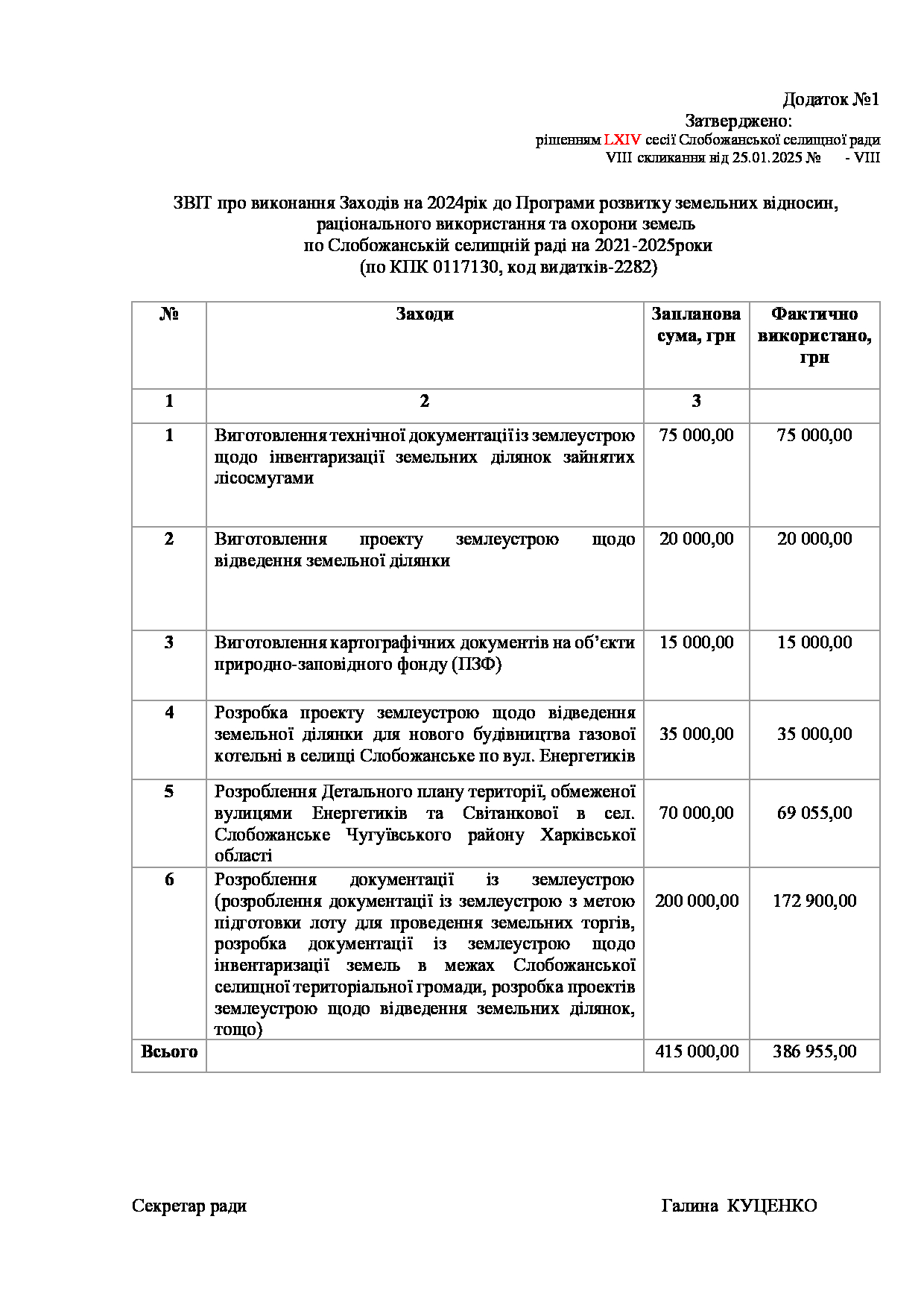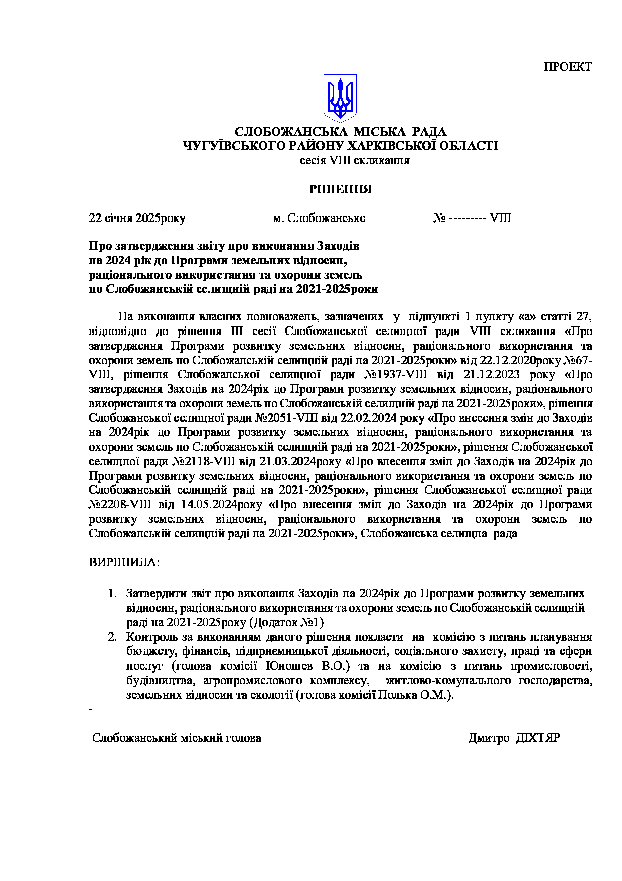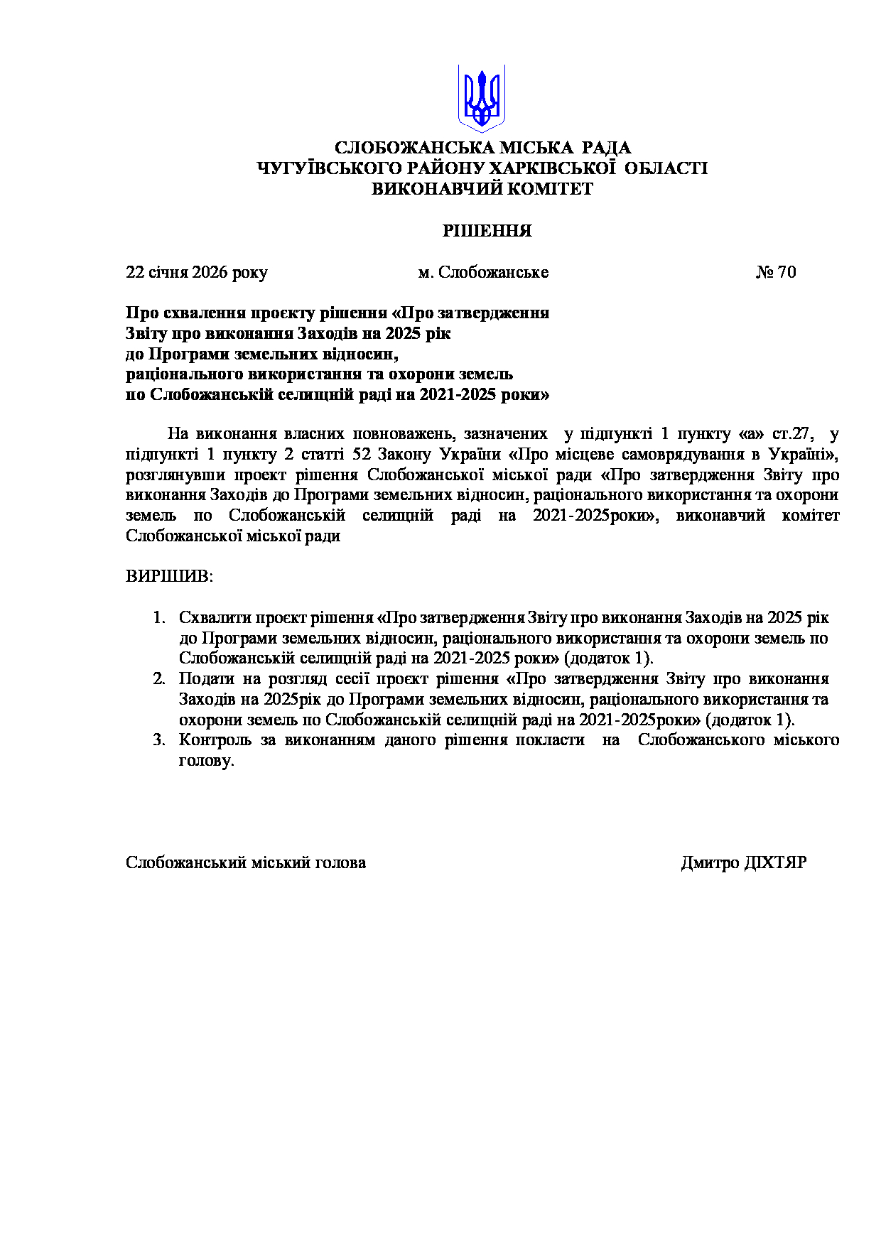 Рішення виконавчого комітету №70 Про схвалення проєкту рішення «Про затвердження Звіту про виконання Заходів на 2025 рік до Програми земельних відносин, раціонального використання та охорони земель по Слобожанській селищній раді на 2021-2025 роки».