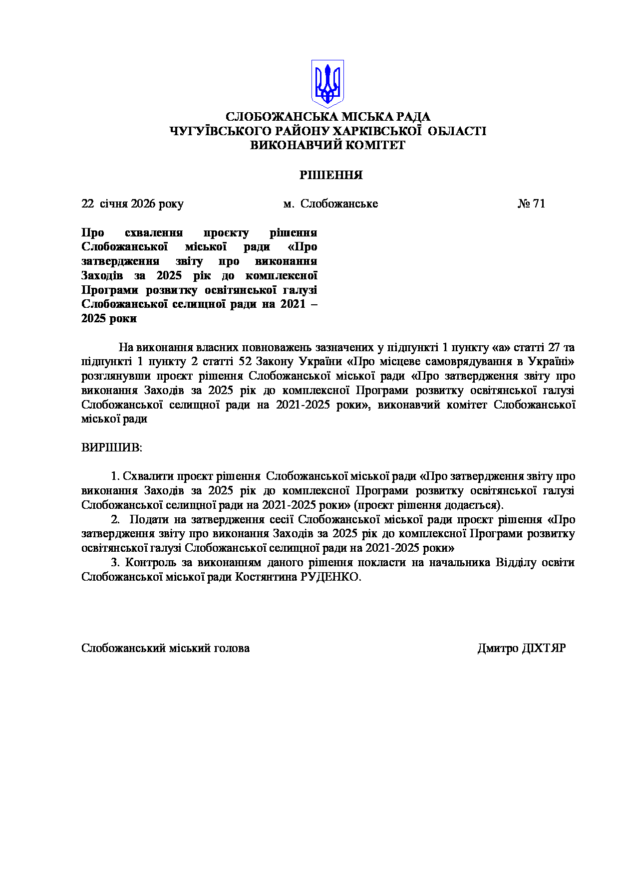 Рішення виконавчого комітету №71 Про схвалення проєкту рішення Слобожанської міської ради «Про затвердження звіту про виконання Заходів за 2025 рік до комплексної Програми розвитку освітянської галузі Слобожанської селищної ради на 2021 – 2025 роки.