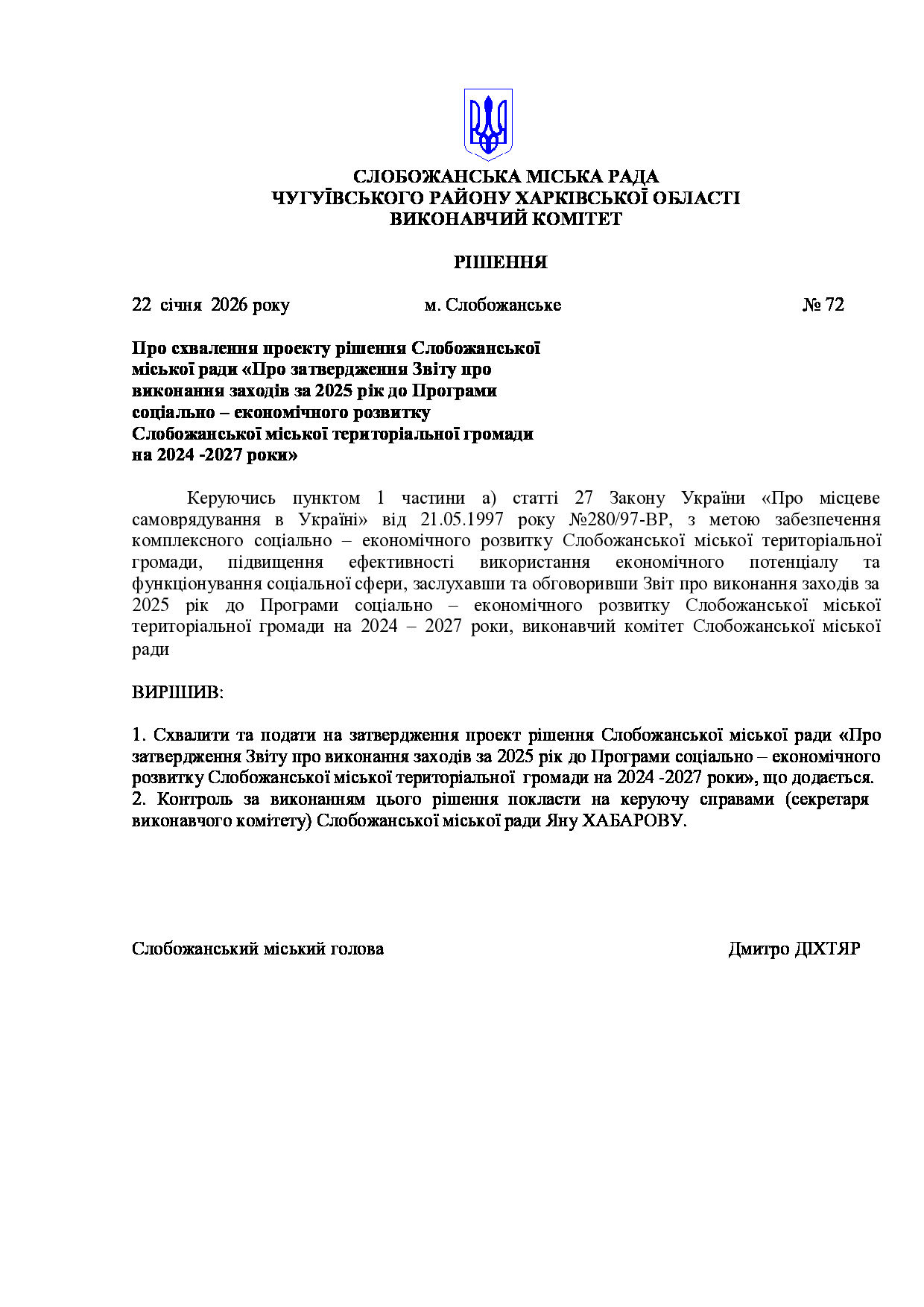 Рішення виконавчого комітету №72 Про схвалення проекту рішення Слобожанської міської ради «Про затвердження Звіту про виконання заходів за 2025 рік до Програми соціально – економічного розвитку Слобожанської міської територіальної громади на 2024 -2027 роки».