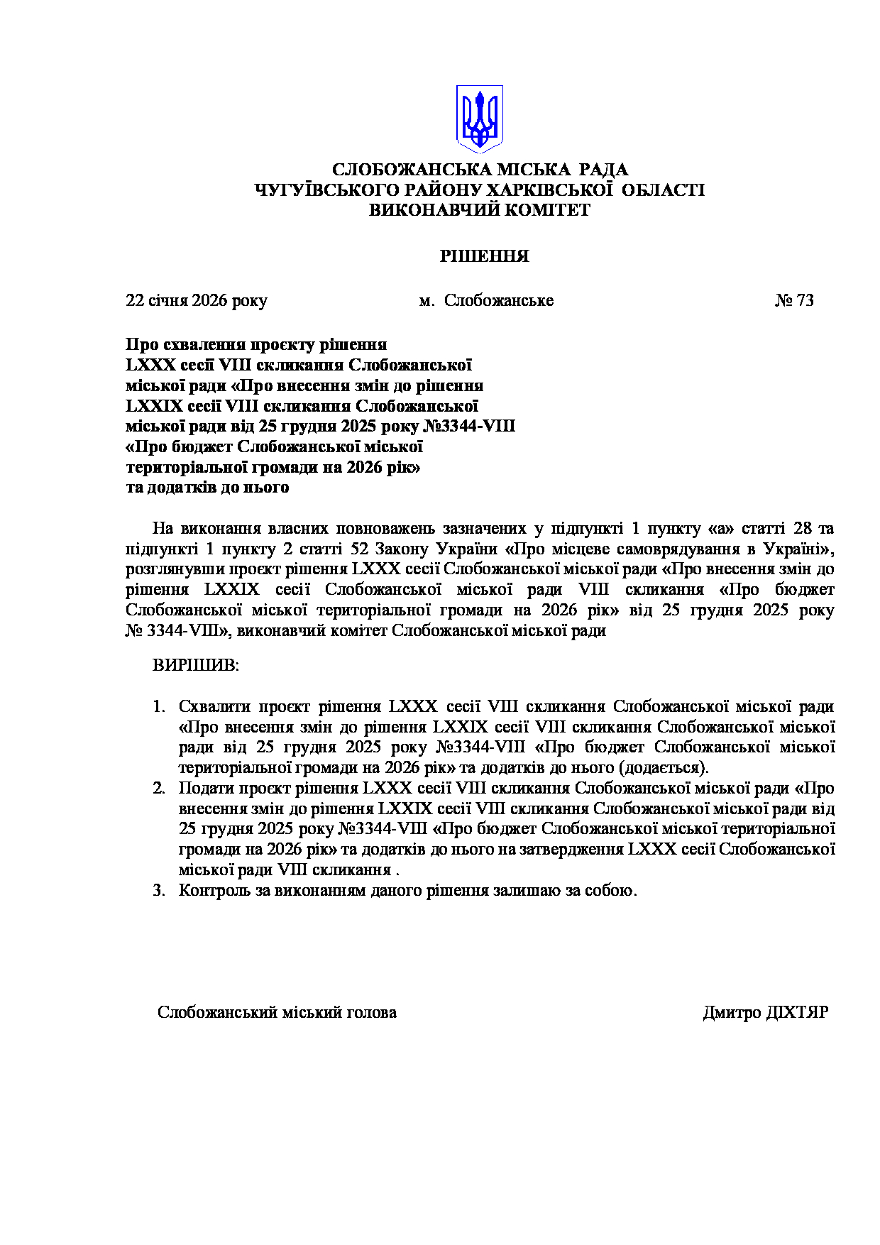 Рішення виконавчого комітету №73 Про схвалення проєкту рішення LXХX сесії VIII скликання Слобожанської міської ради «Про внесення змін до рішення LXXIX сесії VIII скликання Слобожанської міської ради від 25 грудня 2025 року №3344-VIII «Про бюджет Слобожанської міської територіальної громади на 2026 рік» та додатків до нього.
