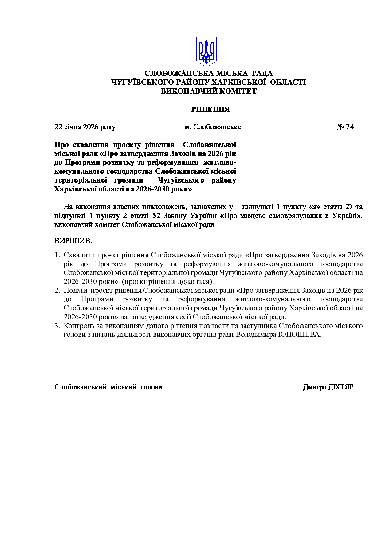 Рішення виконавчого комітету №74 Про схвалення проєкту рішення Слобожанської міської ради «Про затвердження Заходів на 2026 рік до Програми розвитку та реформування житлово-комунального господарства Слобожанської міської територіальної громади Чугуївського району Харківської області на 2026-2030 роки».