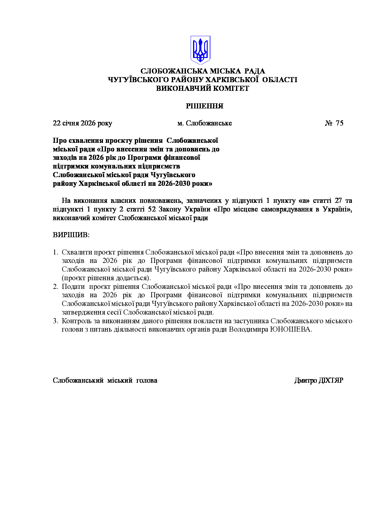 Рішення виконавчого комітету №75 Про схвалення проєкту рішення Слобожанської міської ради «Про внесення змін та доповнень до заходів на 2026 рік до Програми фінансової підтримки комунальних підприємств Слобожанської міської ради Чугуївського району Харківської області на 2026-2030 роки».