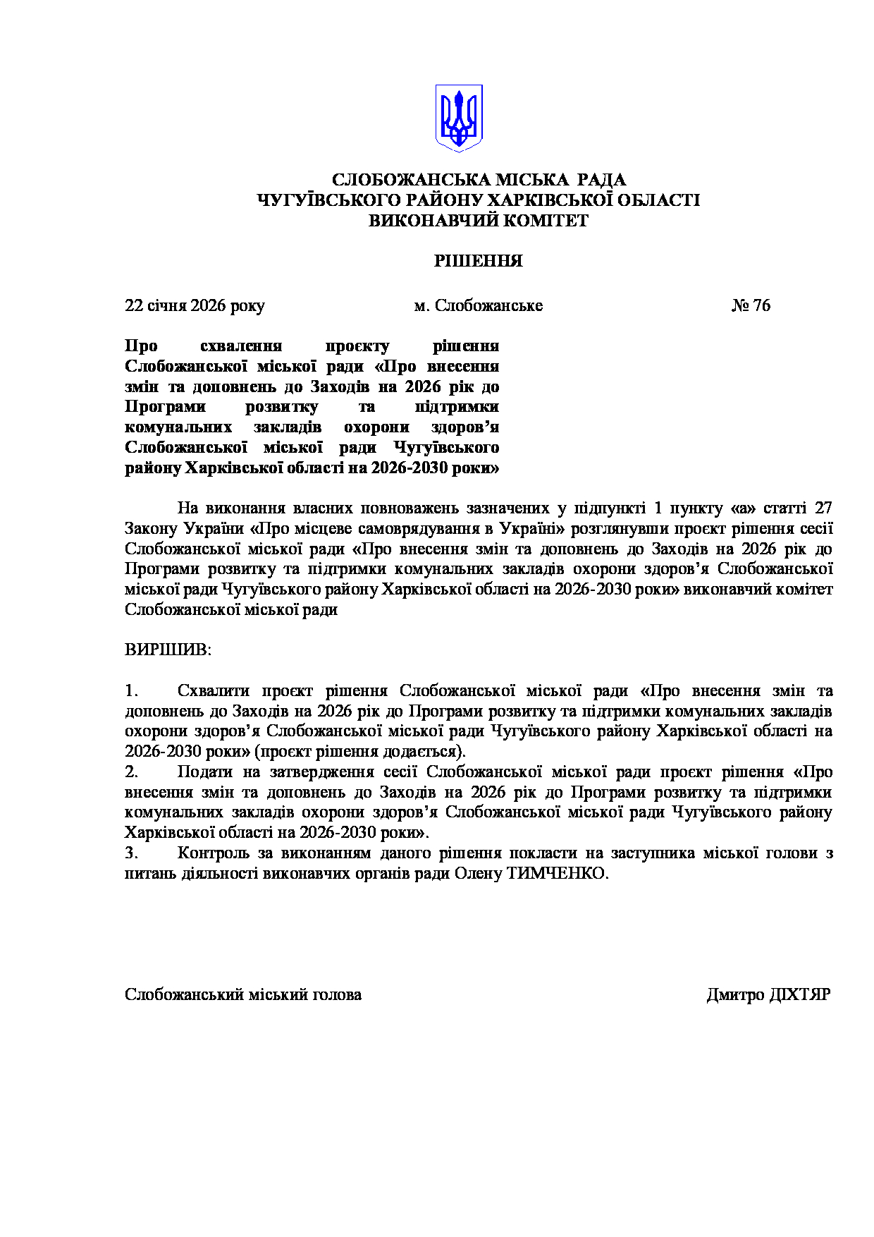 Рішення виконавчого комітету №76 Про схвалення проєкту рішення Слобожанської міської ради «Про внесення змін та доповнень до Заходів на 2026 рік до Програми розвитку та підтримки комунальних закладів охорони здоров’я Слобожанської міської ради Чугуївського району Харківської області на 2026-2030 роки».