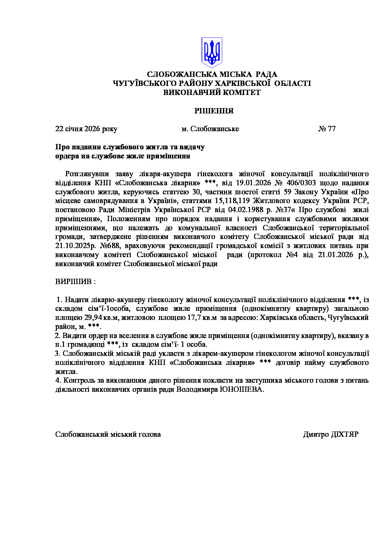 Рішення виконавчого комітету №77 Про надання службового житла та видачу ордера на службове жиле приміщення.