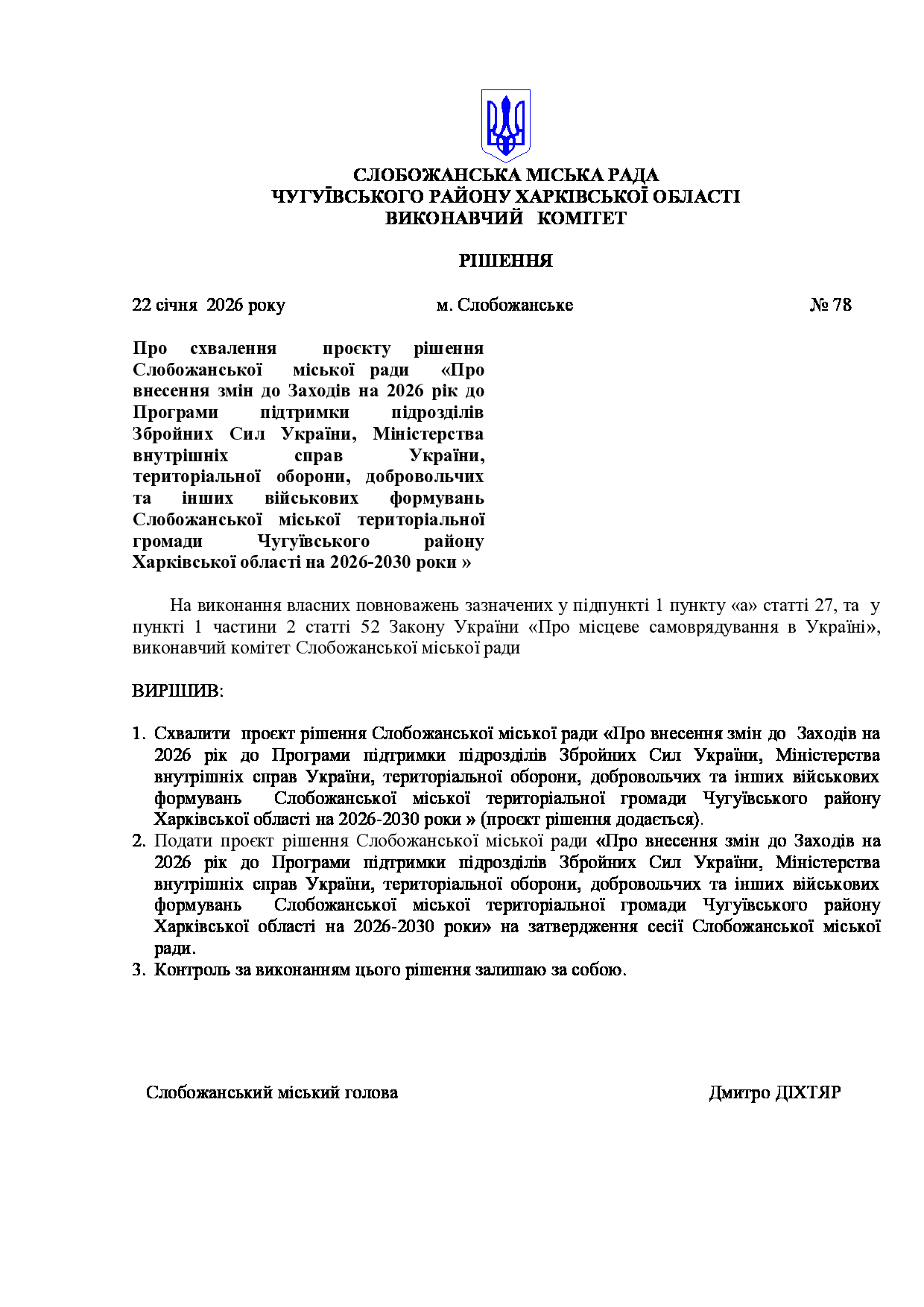 Рішення виконавчого комітету №78 Про схвалення проєкту рішення Слобожанської міської ради «Про внесення змін до Заходів на 2026 рік до Програми підтримки підрозділів Збройних Сил України, Міністерства внутрішніх справ України, територіальної оборони, добровольчих та інших військових формувань Слобожанської міської територіальної громади Чугуївського району Харківської області на 2026-2030 роки ».